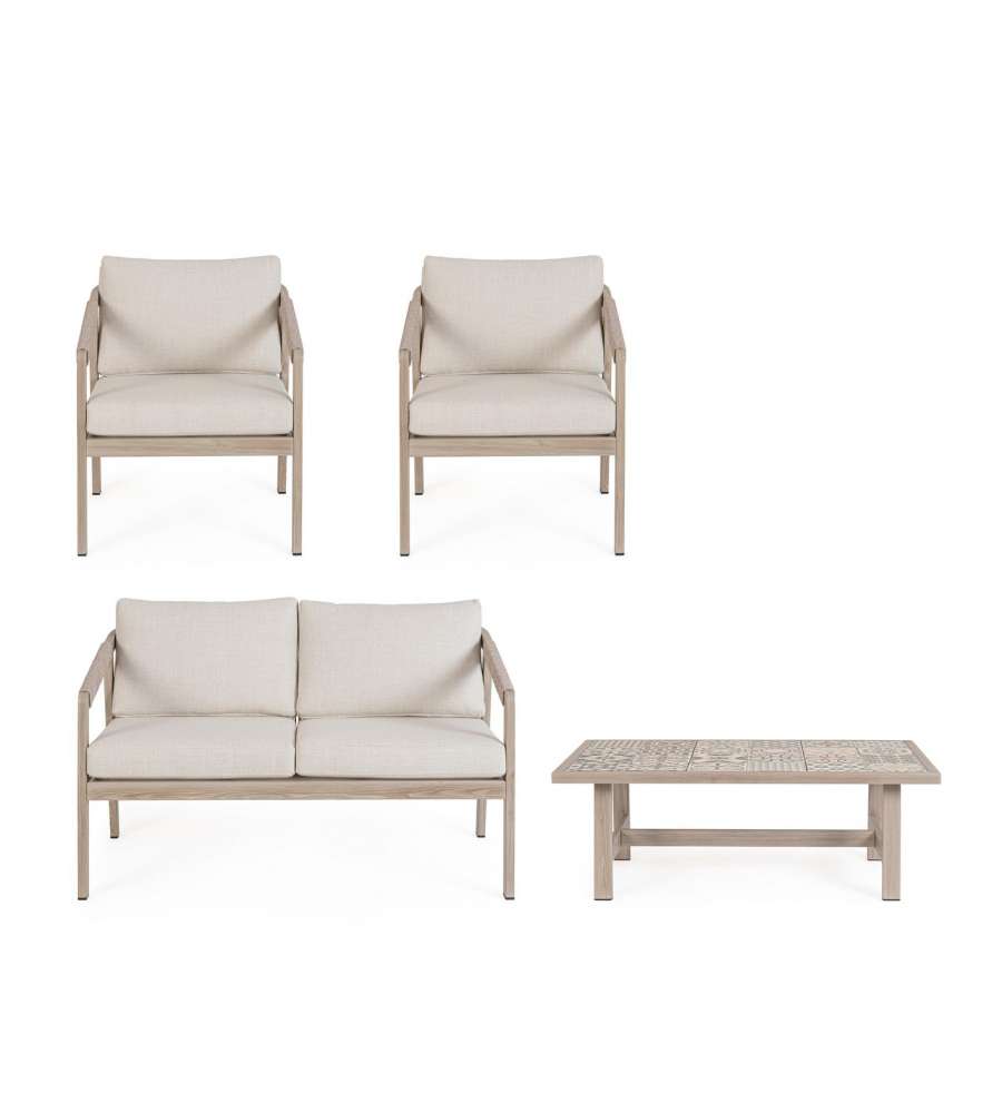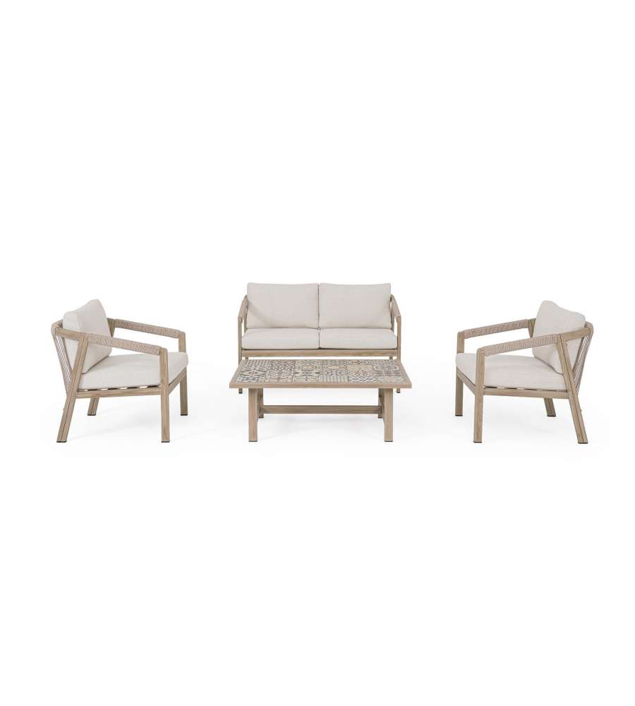 Descrizione: Scopri il Set Kalimera di Bizzotto: eleganza naturale per il tuo giardino. Struttura in alluminio effetto legno, cuscini idrorepellenti e tavolino in porcellana smaltata. Comfort e stile senza compromessi!