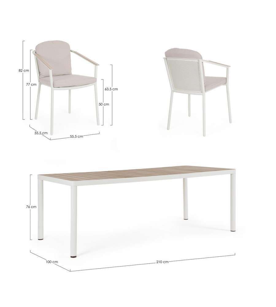 Tavolo 210x100 cm; Sedie Larghezza (a): 55,5 cm Profondità (b): 55,5 cm Altezza complessiva (h): 82 cm Altezza seduta (h1): 50 cm Altezza braccioli (h2): 63,5 cm Altezza totale (h3): 77 cmAltezza: