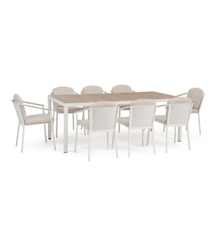 Il Set Tavolo + 8 Sedie con braccioli Ulises Vapor è la soluzione ideale per arredare con eleganza e funzionalità i tuoi spazi esterni. Perfetto per pranzi e cene all'aperto, questo set combina design moderno e materiali di alta qualità per garantire comfort e durata nel tempo. Le sedie ergonomiche sono progettate per offrire il massimo comfort durante l'uso prolungato, mentre il tavolo spazioso permette di accogliere comodamente familiari e amici. Con la sua struttura resistente alle intemperie, questo set è adatto per l'uso esterno e si integra facilmente in qualsiasi contesto di arredo.