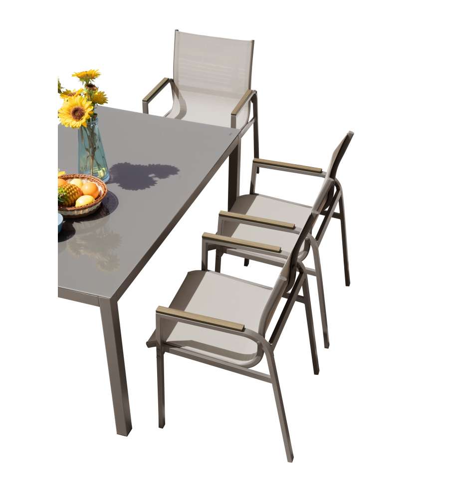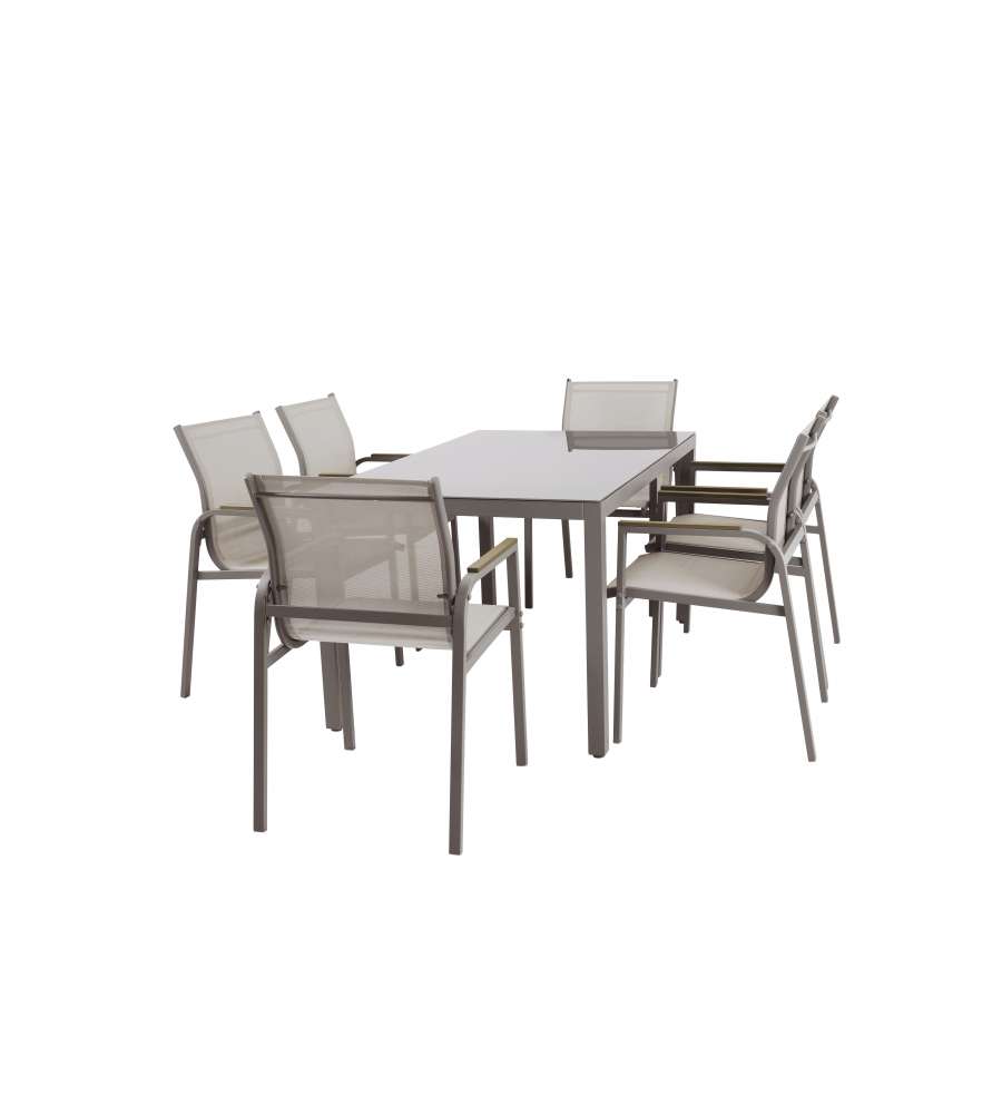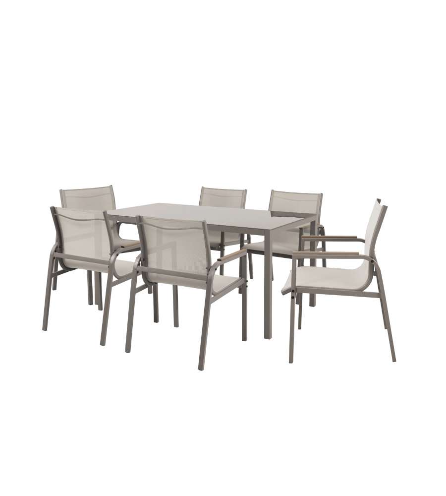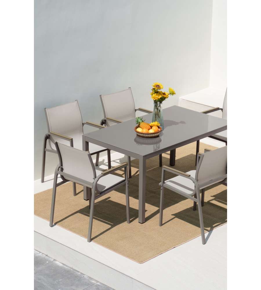 Set da pranzo per esterno con tavolo 150x90 cm in vetro temperato e 6 sedie in acciaio color sabbia. Robusto, resistente agli agenti atmosferici e facile da montare in 30-40 minuti. Comfort garantito grazie ai braccioli.Materiale seduta: