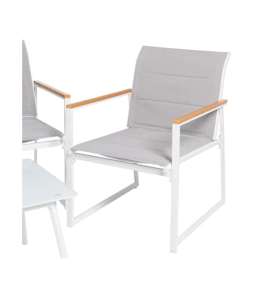 Salotto da giardino Caprera: 1 divano a 2 posti, 2 poltrone e 1 tavolino. Struttura in ferro bianco, dettagli beige. Seduta in texilene traspirante. Design moderno, resistente a ruggine e agenti atmosferici.Materiale seduta: