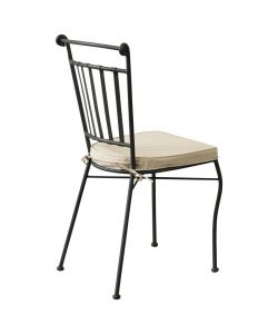 Descrizione: Elegante sedia impilabile in ferro battuto marrone anticato, completa di cuscino ecrù. Dimensioni: 43x50x90 H cm.
