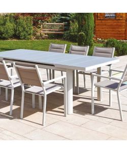 Descrizione: Sedia da giardino bianco e beige con braccioli, ideale per arredare eleganti spazi esterni. Struttura leggera in alluminio resistente alla ruggine e seduta in texilene traspirante. Design impilabile per un facile stoccaggio.