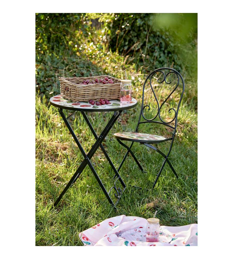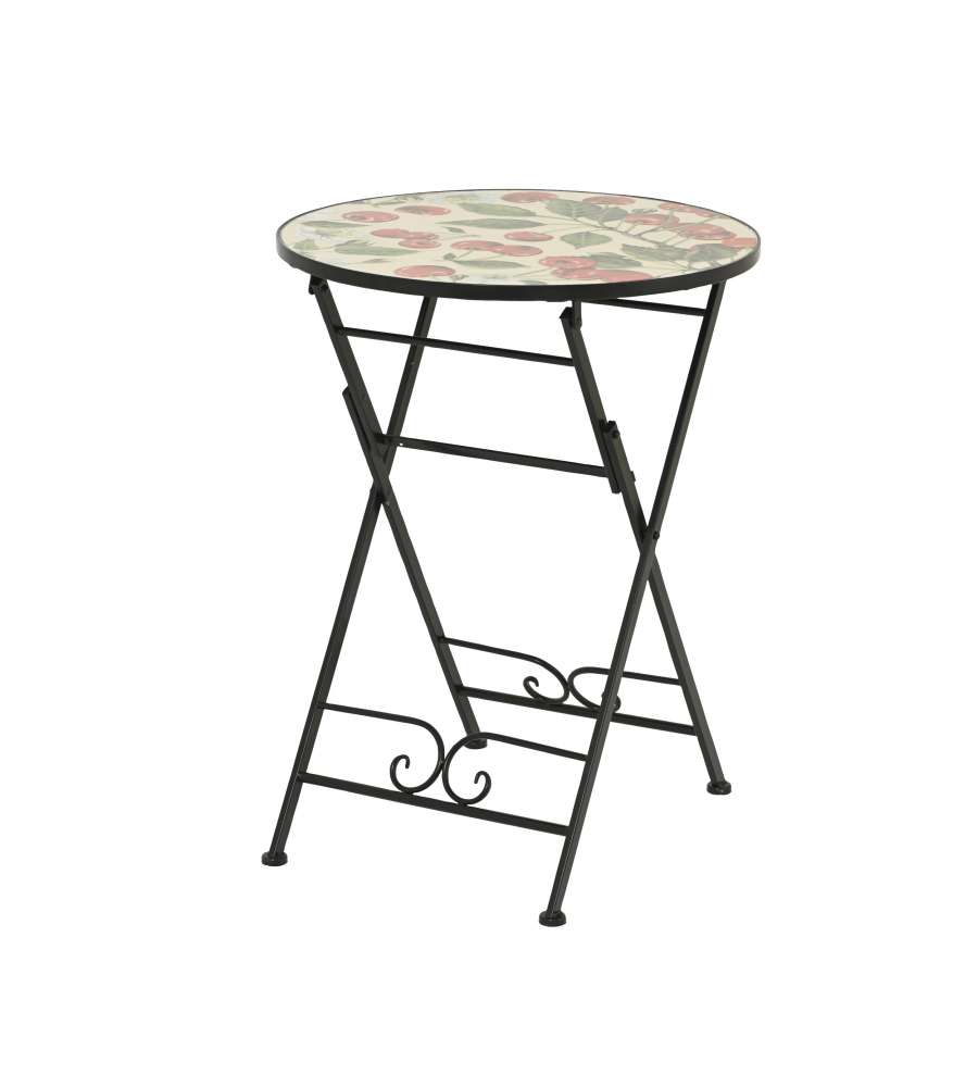 Tavolo pieghevole in acciaio per esterni con piano mosaico decorato a ciliegie. Elegante e funzionale, pesa 13,4 kg e sostiene fino a 40 kg. Perfetto per impreziosire gli spazi esterni. Dimensioni: 58x76 cm. Game in ferro.Portata:
