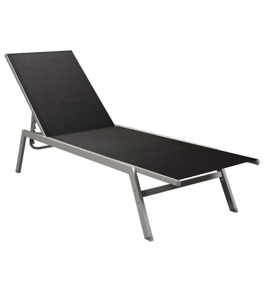Lettino prendisole in acciaio e textilene nero, ideale per giardino o campeggio. Elegante e funzionale, perfetto per rilassarsi.