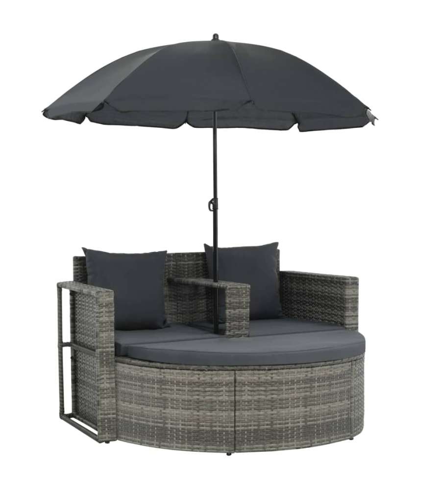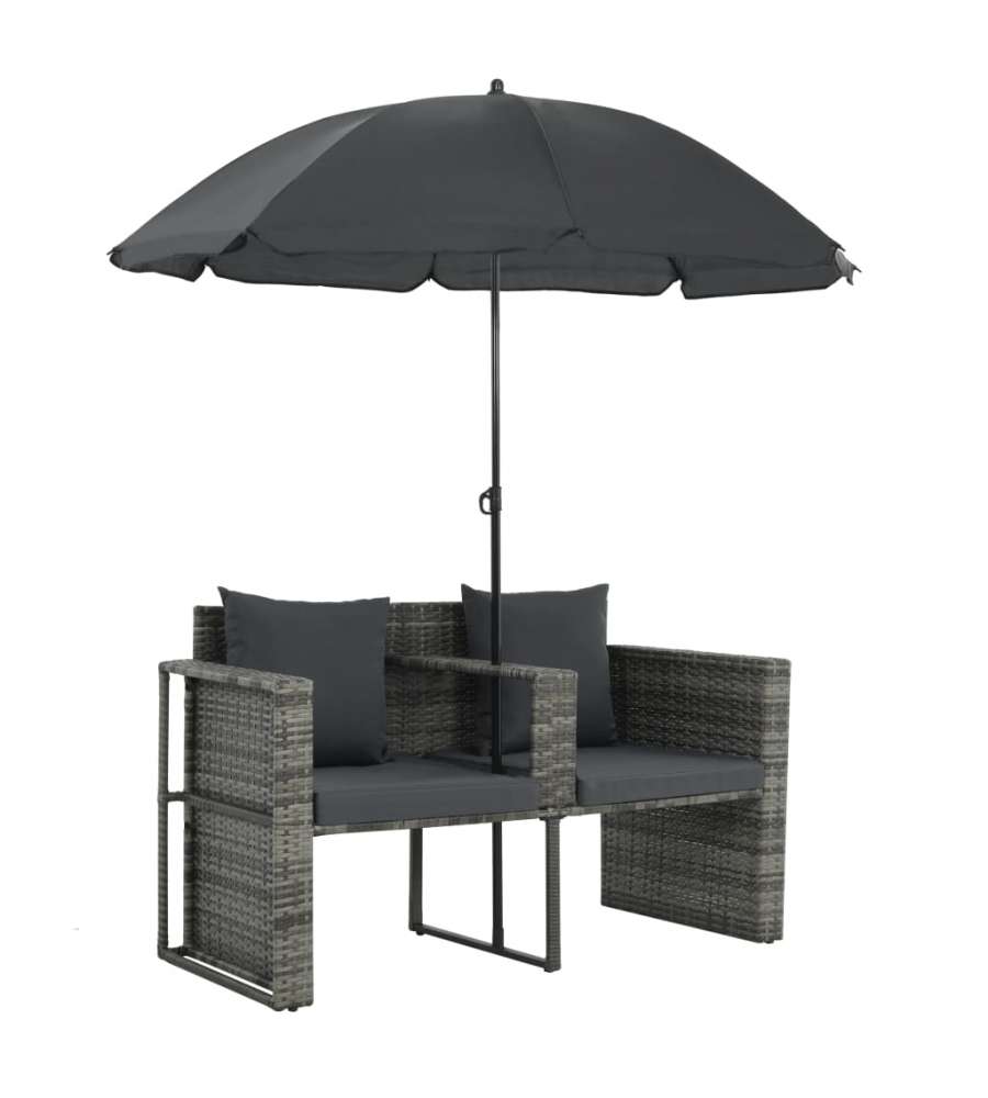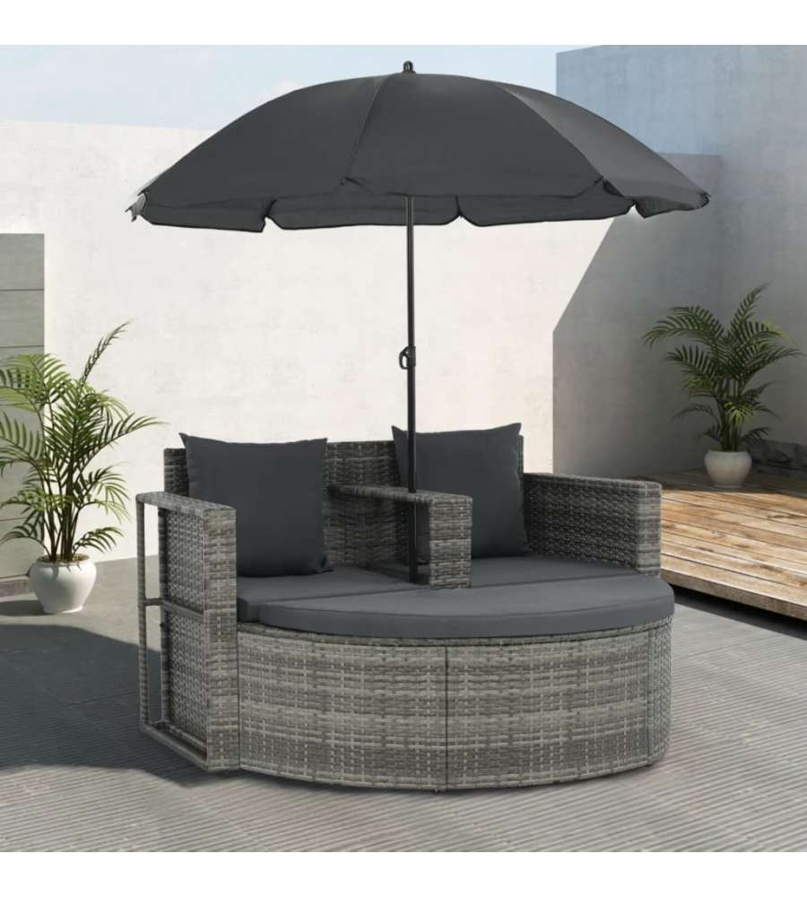 Colore polyrattan: grigio Colore cuscino e ombrellone: grigio scuro Materiale: rattan PE (polietilene) e struttura in acciaio Fodera per cuscino e materiale per ombrellone: 100% poliestere.