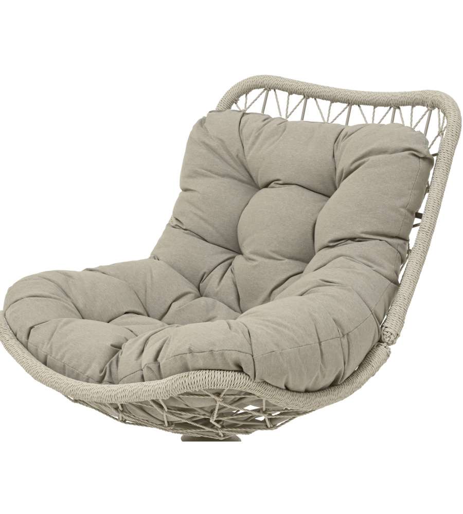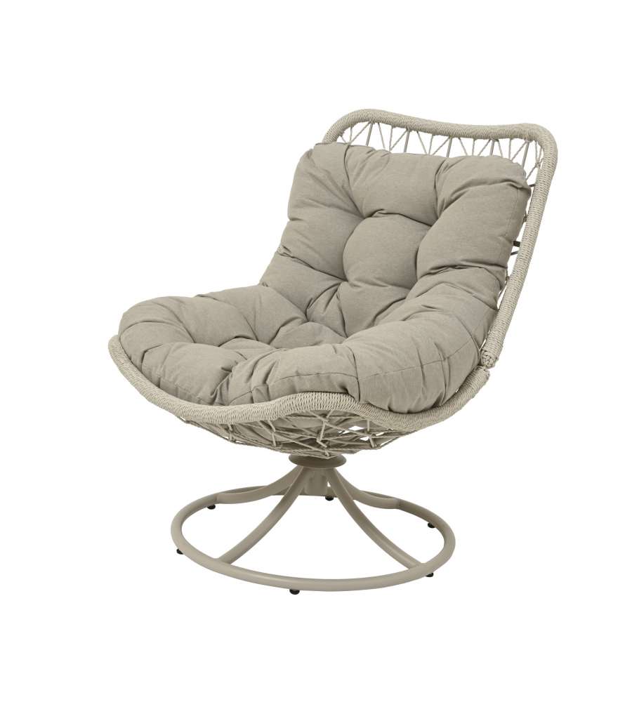 Sedia girevole in vimini grigio per esterni con cuscino, resistente all'acqua. Struttura in ferro, altezza seduta 46 cm, portata massima 120 kg, leggera con 10 kg di peso. Ideale per il relax all'aperto.Portata: