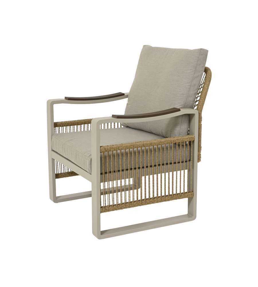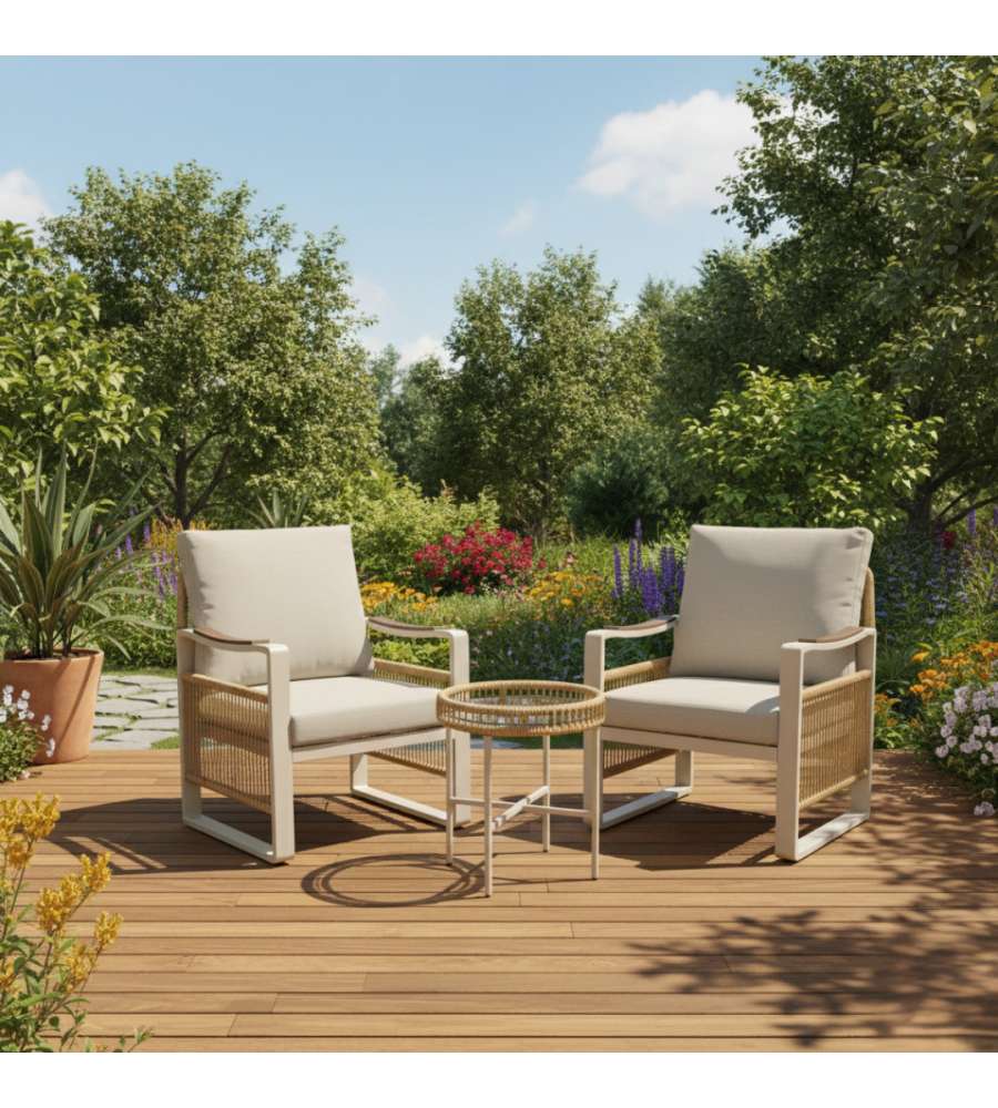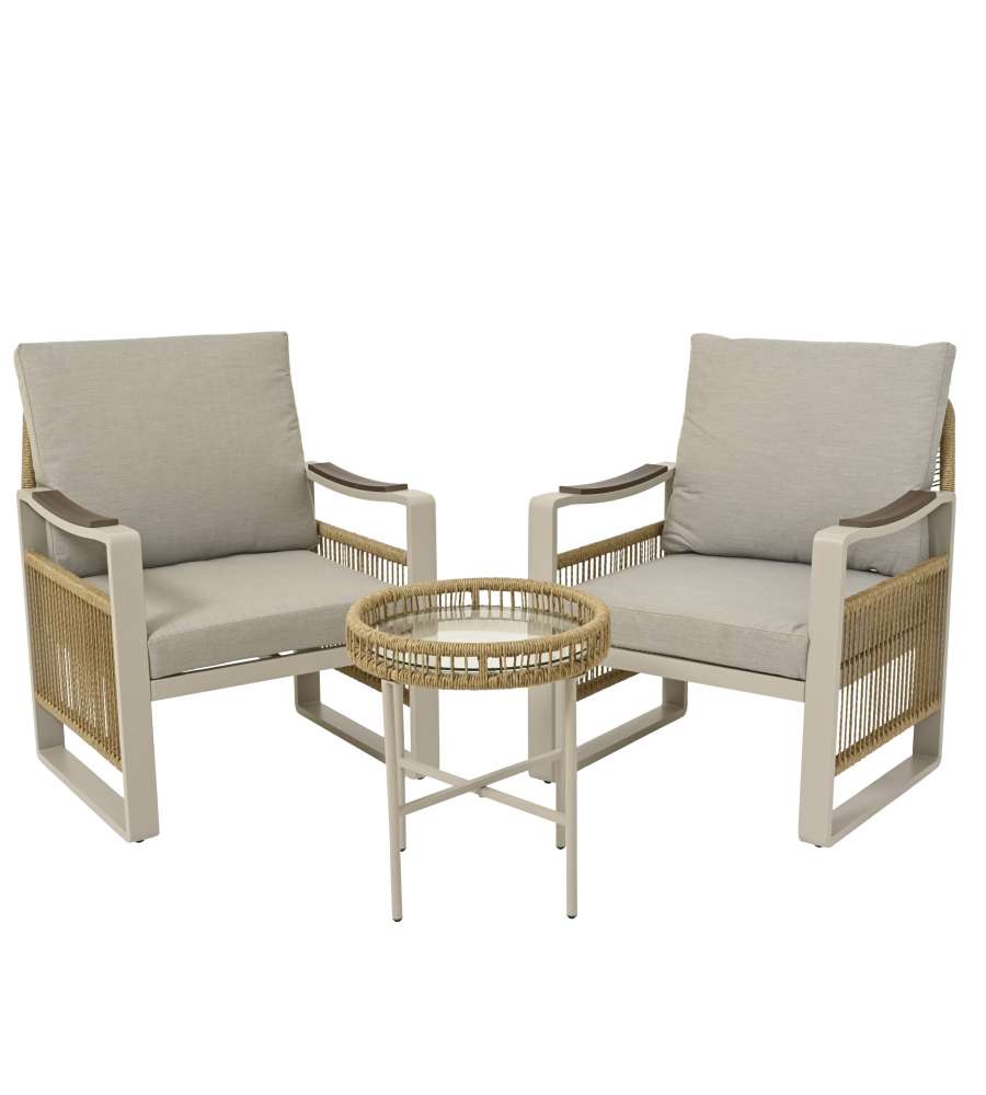 Set salotto in alluminio beige, composto da 2 poltroncine e tavolino con top in vetro temperato. Cuscini sfoderabili in poliestere, portata massima 120 kg. Dimensioni tavolo: D46xH53 cm; sedie: L69xP75xH82 cm. Peso totale 24,7 kg.Portata: