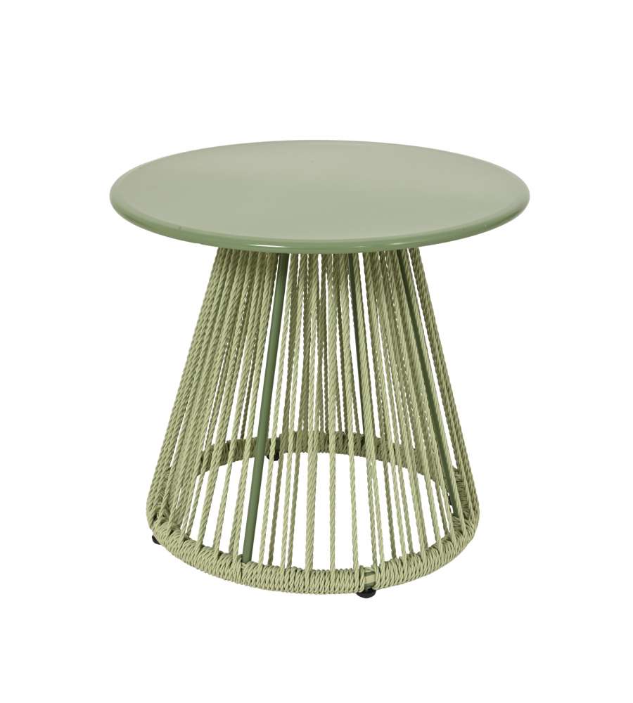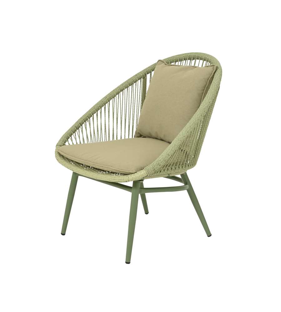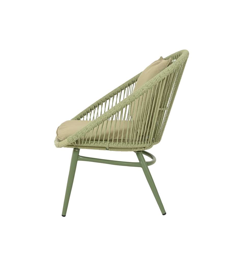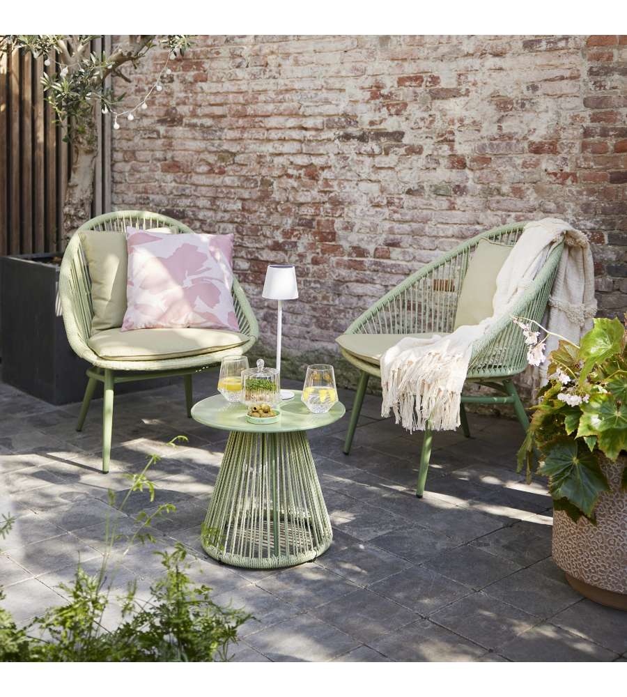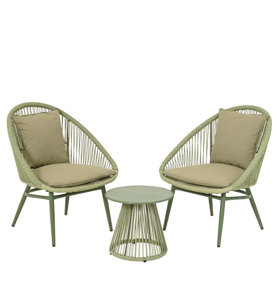 Set salotto da giardino in vimini verde con 2 sedie e tavolino. Struttura in ferro, cuscini sfoderabili in poliestere. Sedie: L69xP72xH86 cm, tavolo: D43xH40 cm. Capacità max 120 kg. Top tavolo in vetro temperato. Comfort e stile per esterni.Portata: