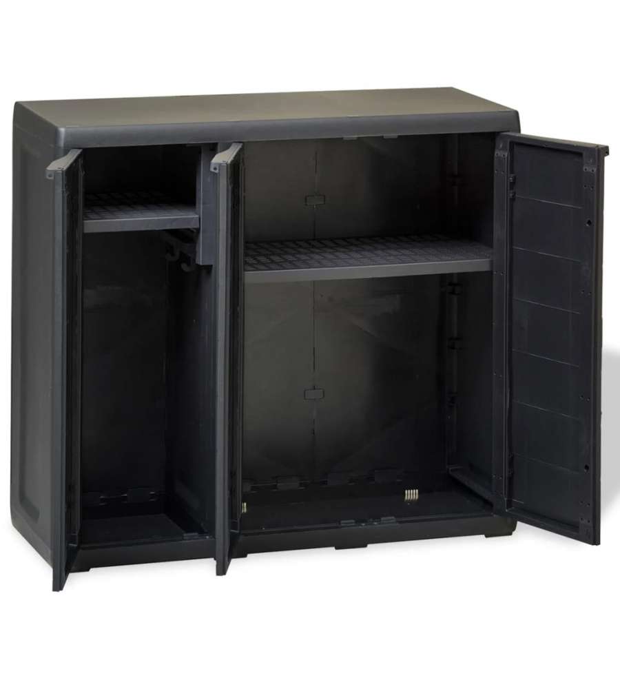 Colore: Nero Materiale: Polipropilene (PP) Dimensioni: 97x38x87 cm (LxPxA) Con 3 porte e 2 ripiani regolabili ventilati Ogni ripiano ha un blocco di sicurezza (per evitare che si muova).