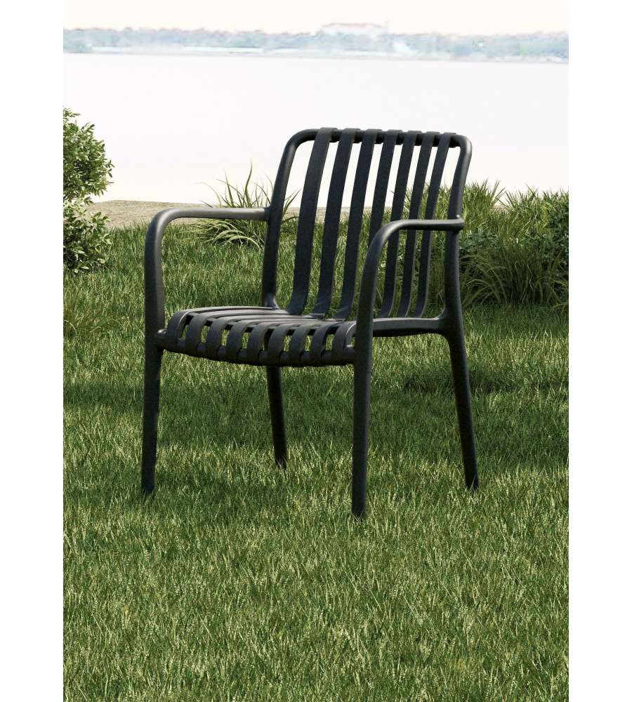 Descrizione: Sedia da esterno impilabile in polipropilene grigio antracite, resistente e lavabile. Design moderno con doghe e braccioli integrati, perfetta per terrazzi, giardini e locali.