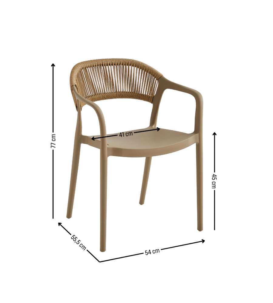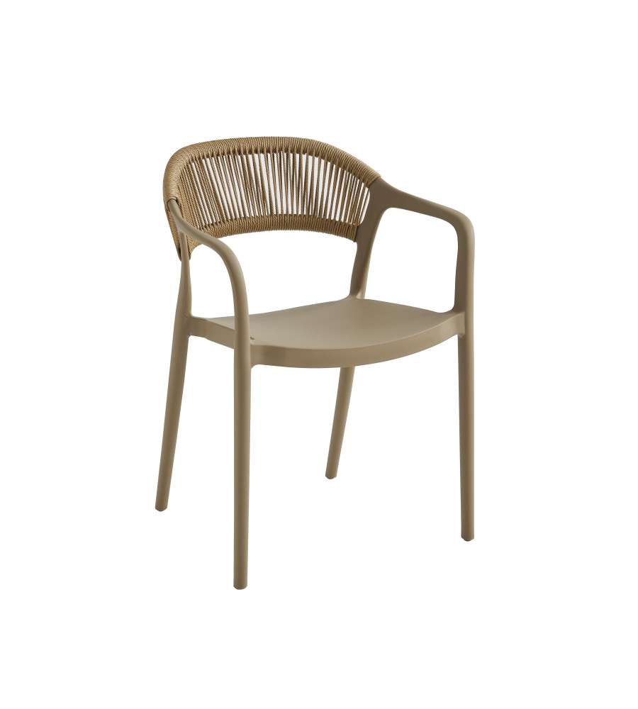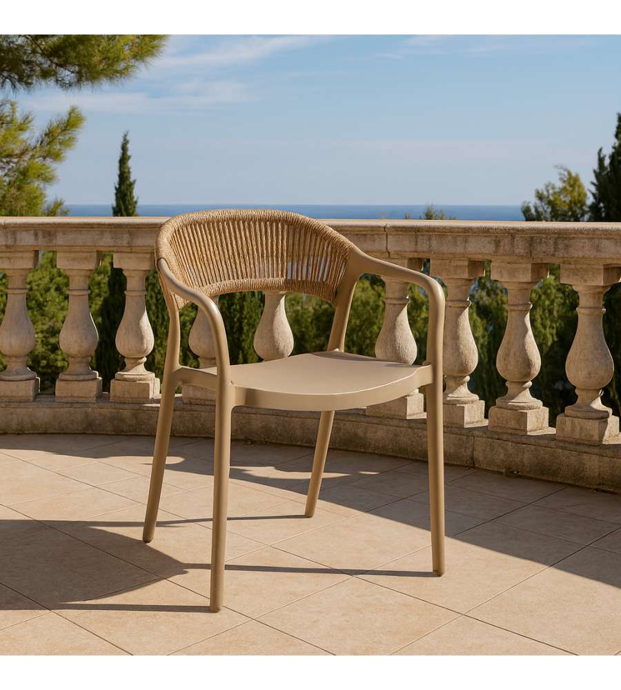 Sedia impilabile in polipropilene beige, leggera (4,5 kg) e resistente (portata120 kg). Schienale in corda intrecciata, braccioli integrati e design morbido. Ideale per giardini e terrazzi, adatta anche per ambienti interni grazie al suo design.Portata: