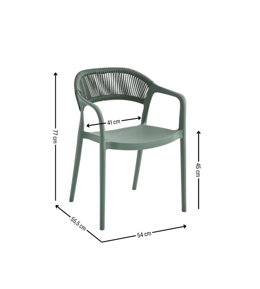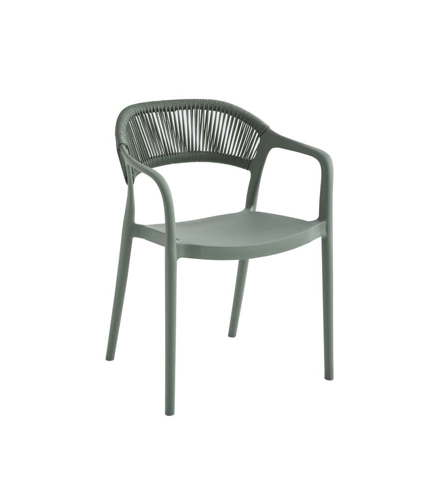 Poltroncina in polipropilene, 54x55,5x77 cm, leggera (4,5 kg) e impilabile, con portatafino a 120 kg. Schienale in corda intrecciata e braccioli integrati. Ideale per esterni, giardini e terrazzi, design morbido.Portata: