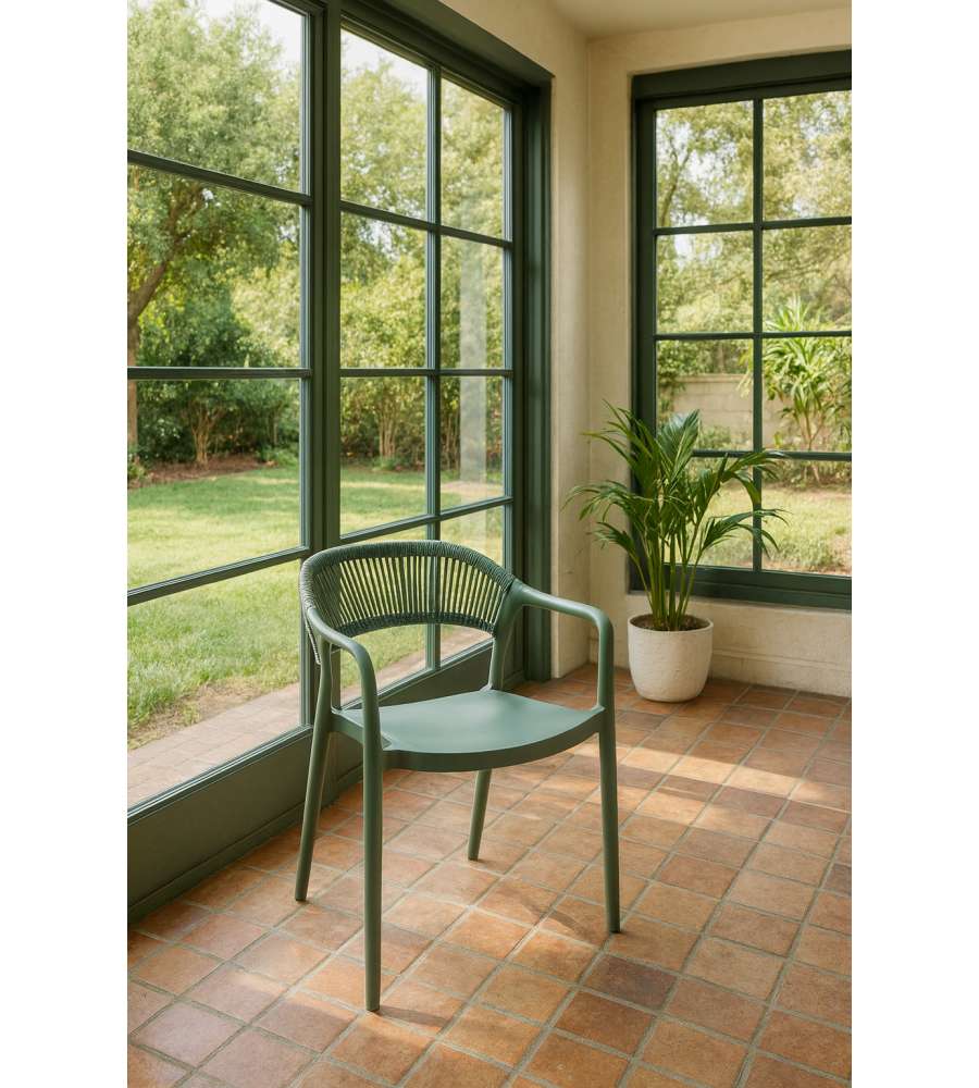 Descrizione: Scopri la sedia Janas Verde Domo Mea. Leggera e impilabile, con schienale in corda intrecciata e braccioli ergonomici. Versatile: perfetta per ambienti esterni come giardini, ma anche interni. Resistente e stylish!