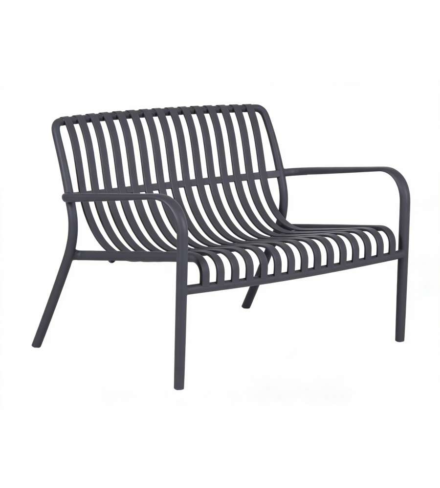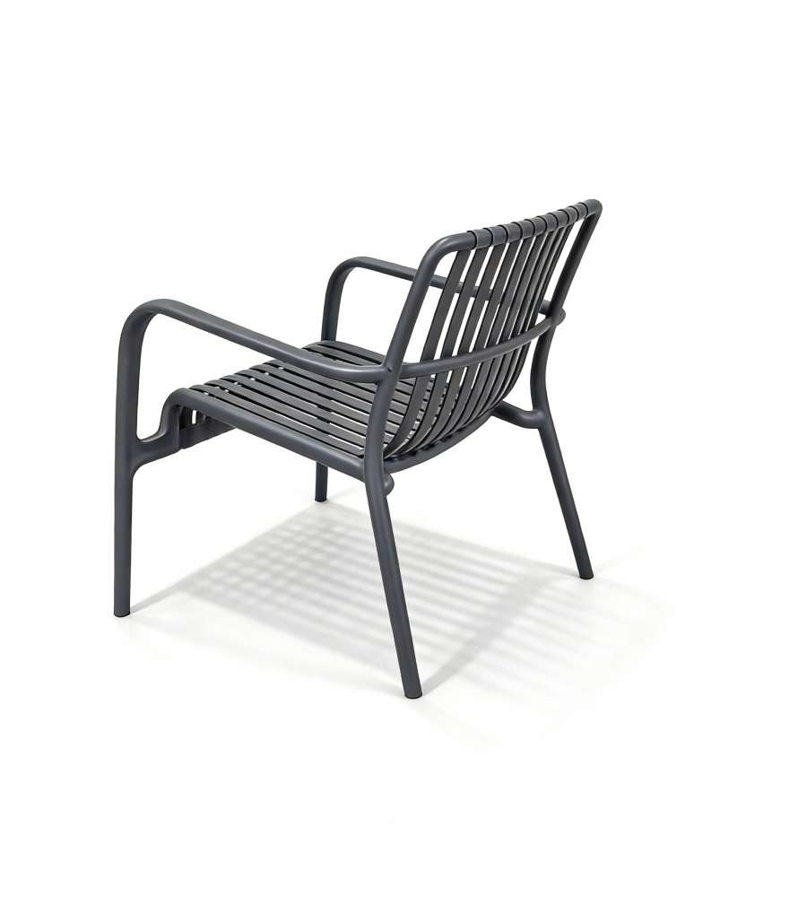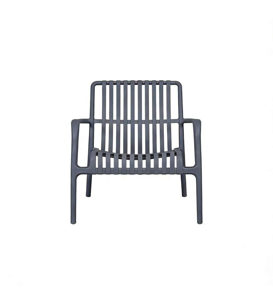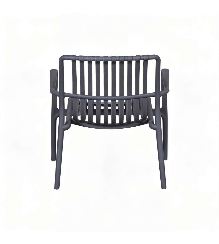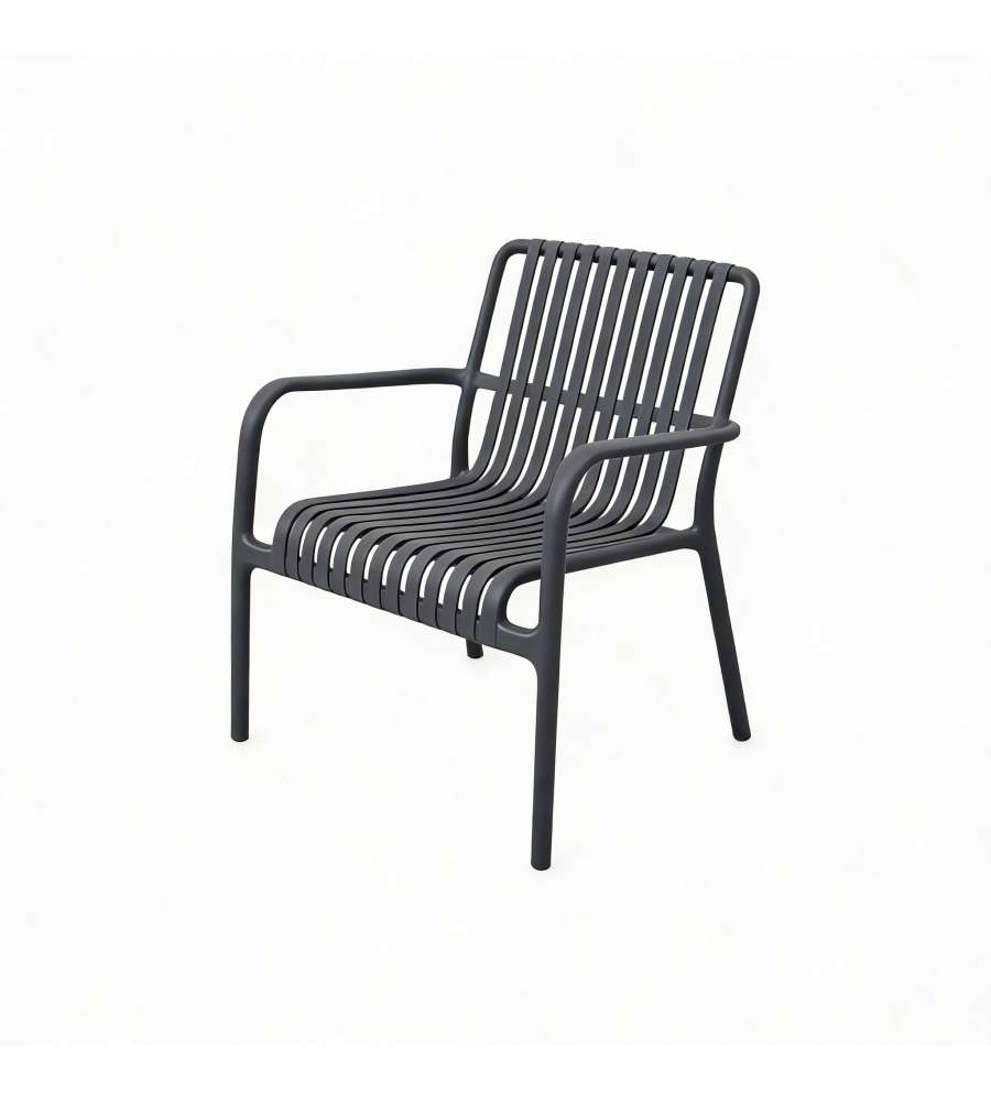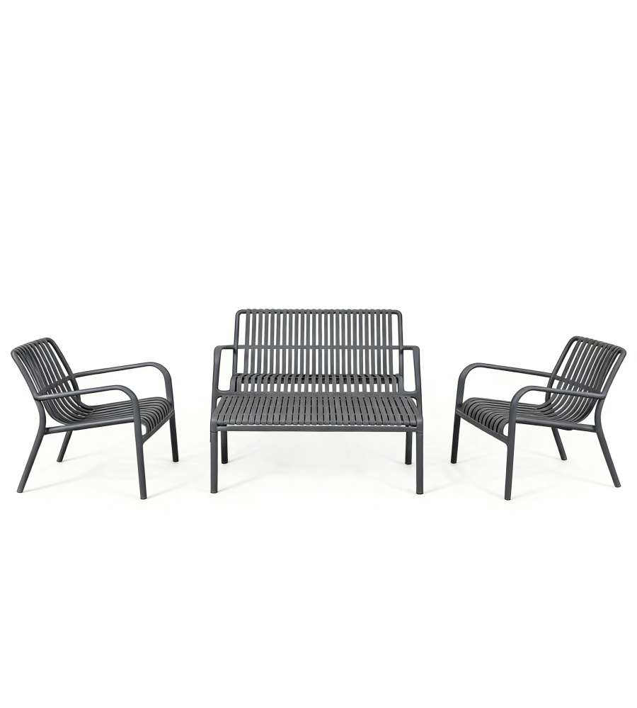 Set salotto da giardino Domo Mea in polipropilene antracite, composto da divanetto, 2 poltroncine impilabili e un tavolino. Facile assemblaggio in 5 minuti, portata fino a 150 kg, resistente agli agenti atmosferici e design moderno.Portata: