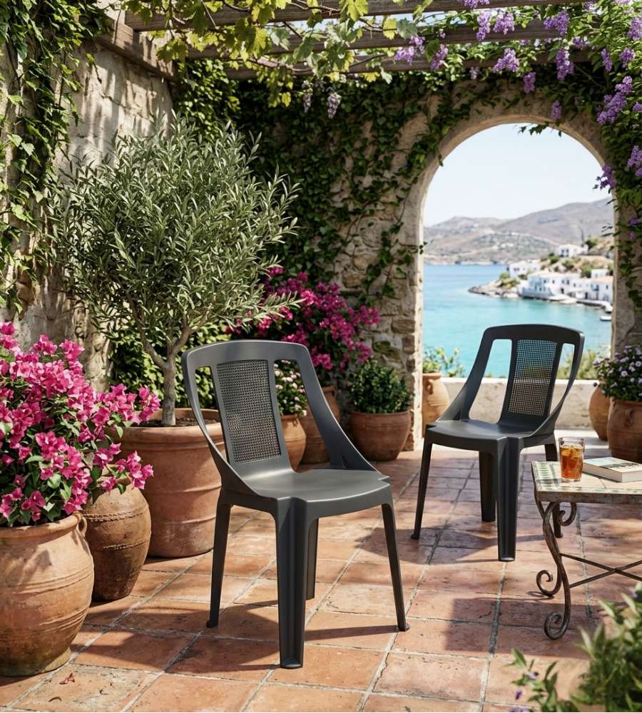 Sedia impilabile in polipropilene, dimensioni 48 x 52,5 x 81 cm, peso 2,5 kg. Design elegante in antracite, ideale per esterni. Abbinabile al tavolo Ago (cod. 001140077) per un ambiente coordinato e raffinato.Uso esterno: