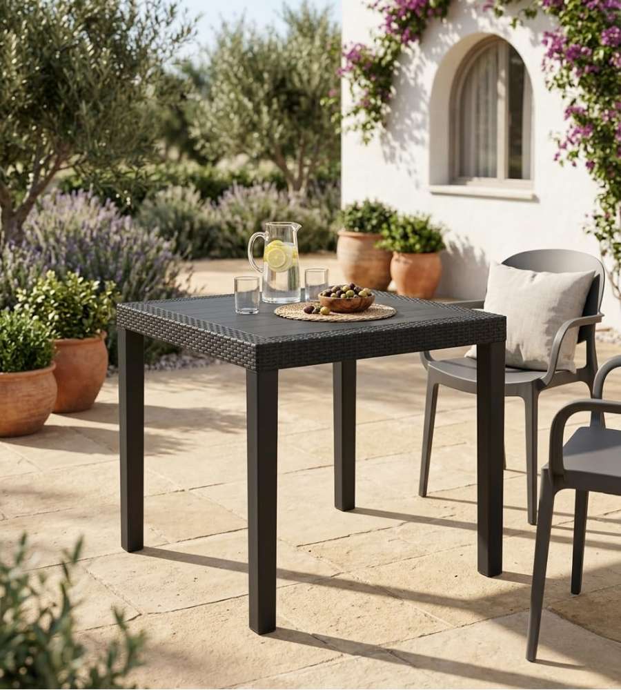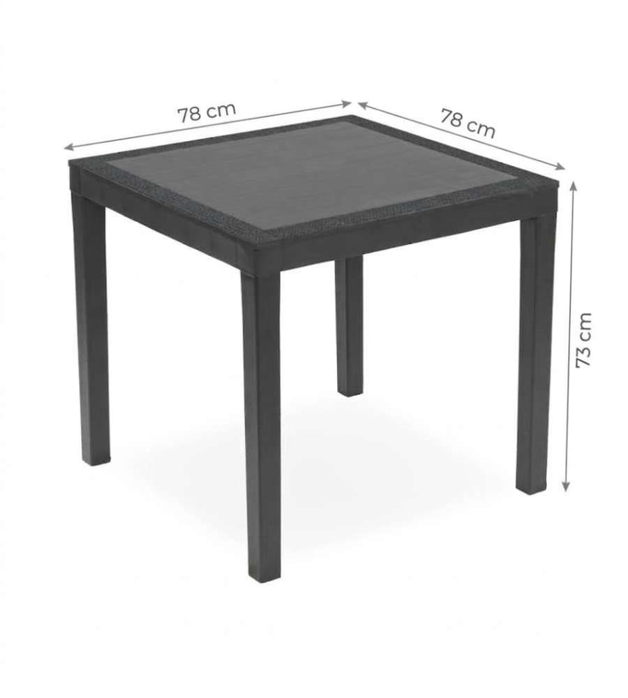 Tavolino quadrato in polipropilene effetto juta, colore antracite. Dimensioni: 78x78x73 cm, peso 8 kg. Ideale per arredo esterno, resistente e leggero, perfetto per giardini e terrazzi. Design moderno e funzionale.Materiale struttura: