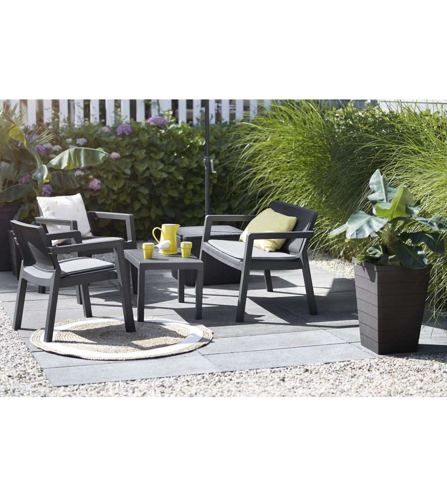 Il Salottino Emily Grafite Keter è la scelta ideale per chi cerca un'opzione di arredo esterno elegante e funzionale. Questo set è perfetto per godersi momenti di relax in giardino, terrazzo o patio, grazie alla sua struttura resistente e al design accattivante.
