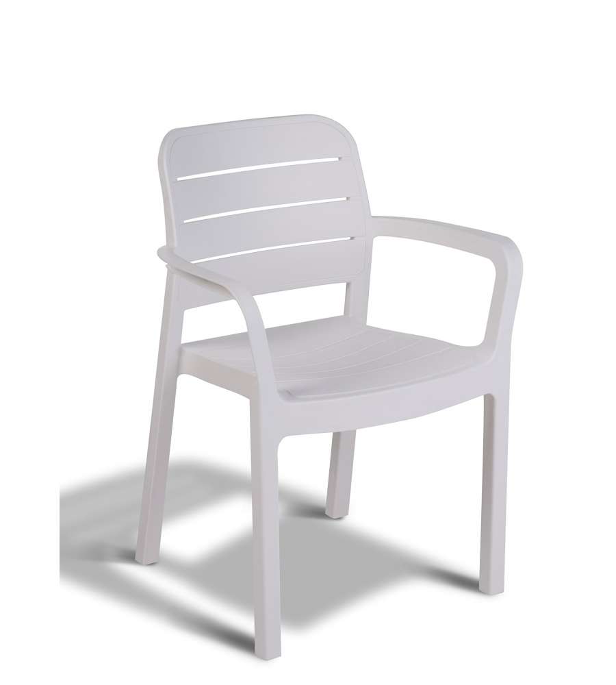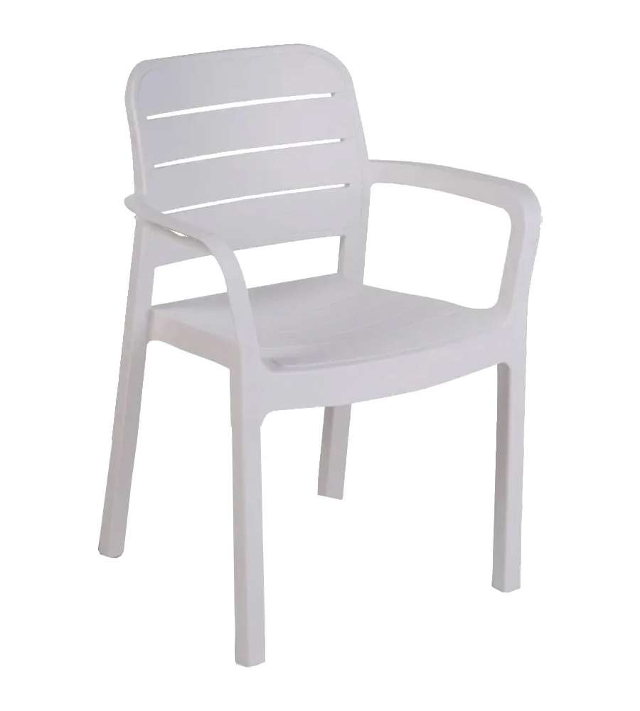 Sedia da esterno in polipropilene, resistente e leggera. Dimensioni: 58x53x83 cm. Colore bianco elegante, ideale per giardini e terrazzi. Design con braccioli per comfort ottimale. Facile da pulire e mantenere.Uso esterno: