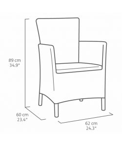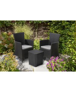 Le sedie hanno comodi braccioli e uno schienale ergonomico per un grande comfort di seduta. ? incluso un cuscino abbinato. Il tavolo incluso ha lati e doghe in aspetto rattan e presenta un vano portaoggetti nascosto sotto il piano del tavolo. Questo comodo set da giardino ? realizzato in plastica resistente all'usura, agli agenti atmosferici e che non richiede manutenzione. Quindi durer? per anni senza usurarsi o arrugginirsi.