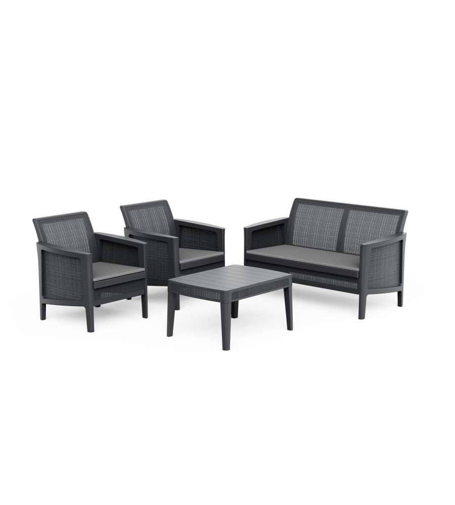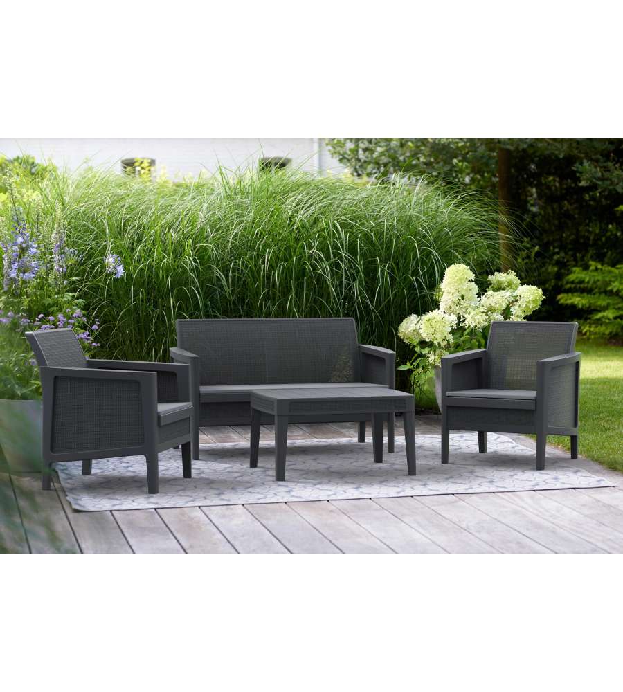 Descrizione: Set Salotto da Giardino Atlas Keter in finitura juta color grafite, con cuscini inclusi. Resistente agli agenti atmosferici, include 2 poltrone, un divano a 2 posti e un tavolino. Design moderno, facile da pulire.