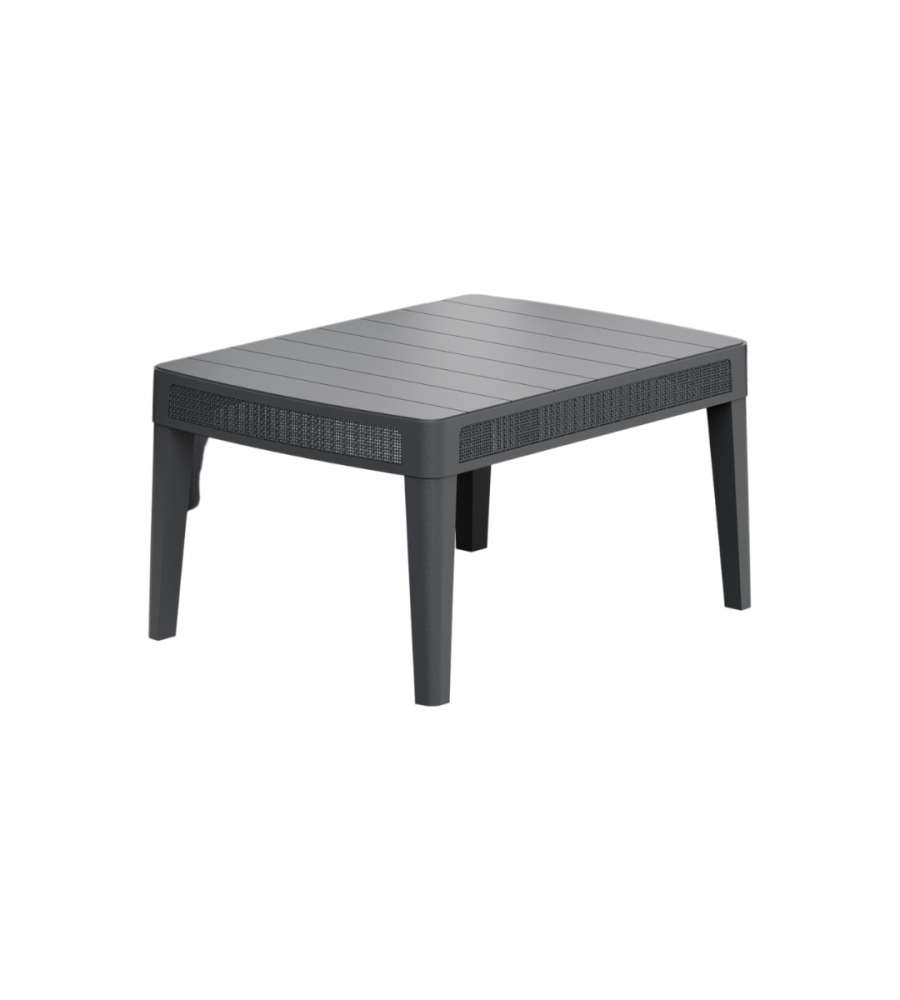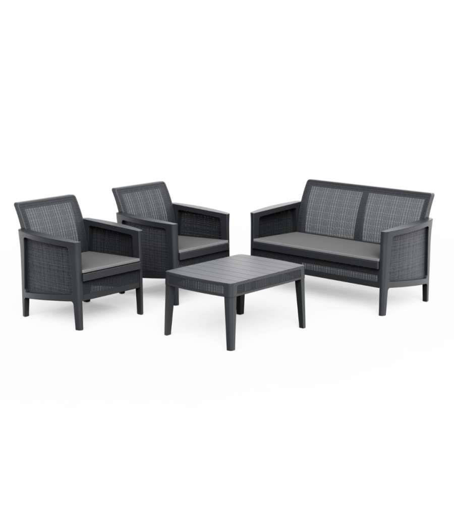 Set salotto da giardino in finitura juta grafite, composto da due poltrone, un divano a due posti e un tavolino. Materiali resistenti a umidità e UV, design moderno e facile manutenzione. Ideale per spazi esterni.Materiale seduta: