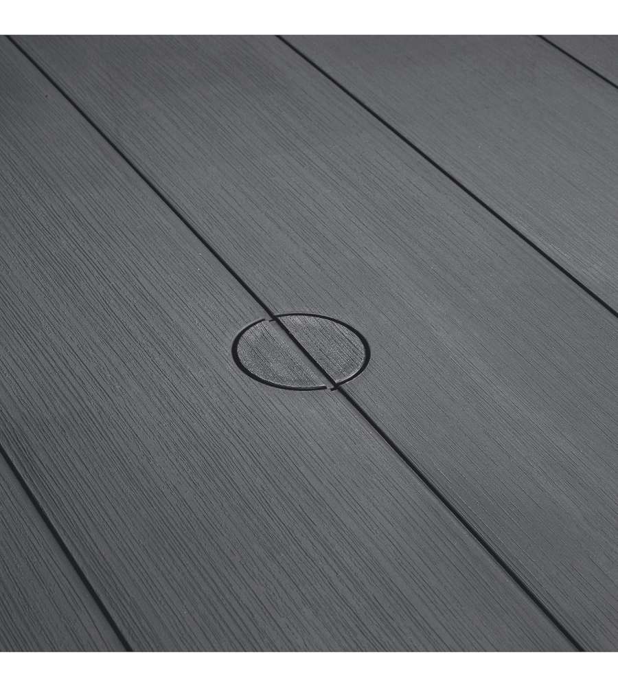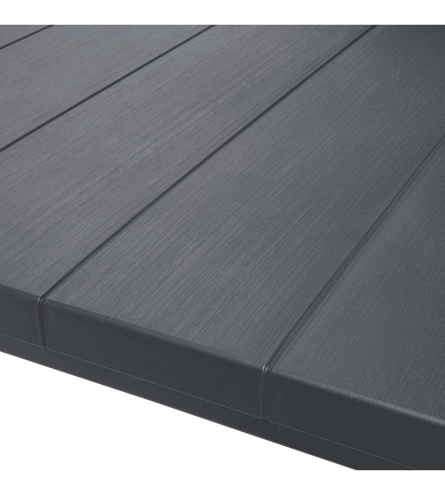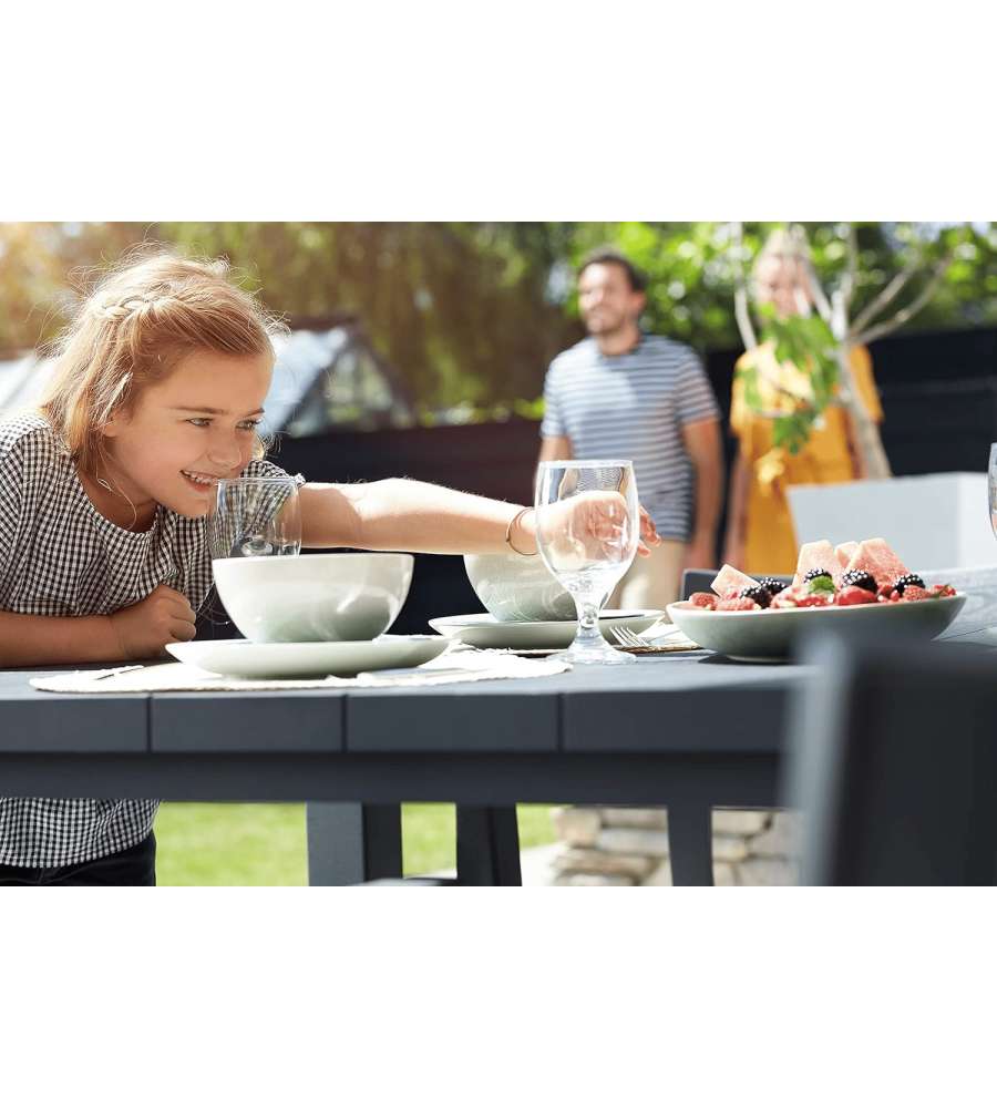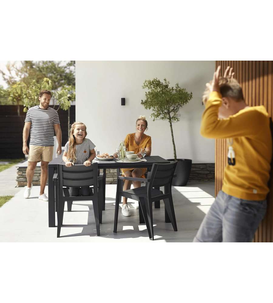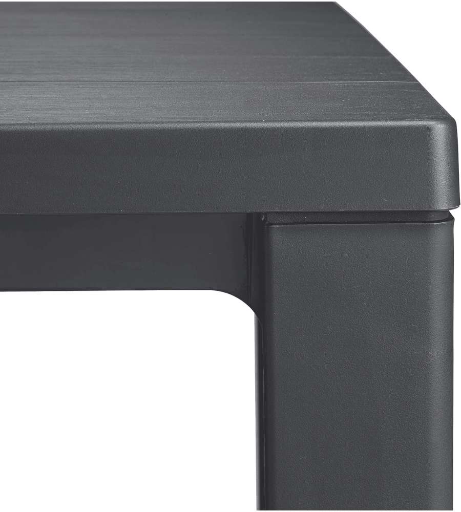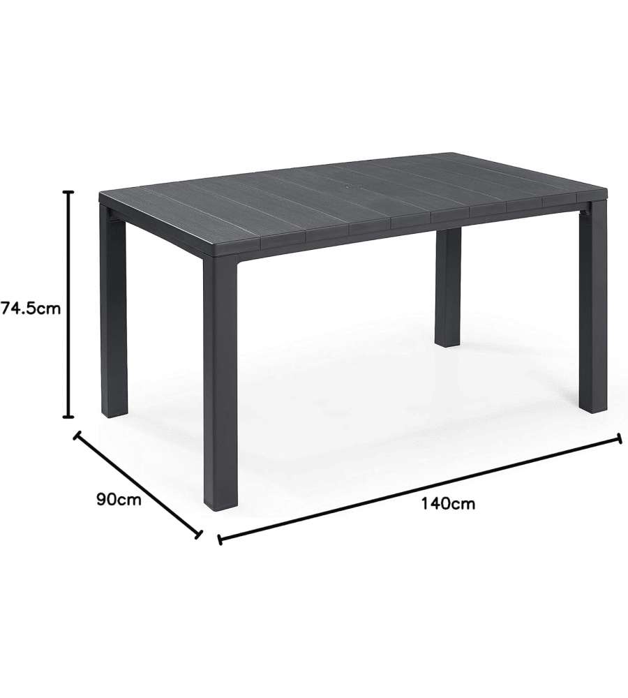 Tavolo da esterno Keter Julie, 147x90x74.5 cm, colore grafite. Design elegante e lineare, struttura in metallo, predisposizione per ombrellone. Facile da montare in 5 minuti, adatto per 6 persone, resistente e durevole con effetto legno spazzolato.Capacità: