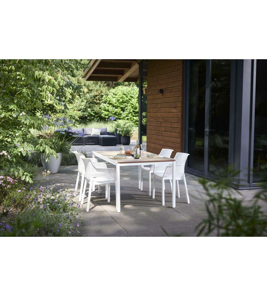 Tavolo da pranzo Keter Porto con struttura in metallo bianco e piano effetto legno. Dimensioni 160x95x75h cm, adatto per 6 persone. Facile da montare e resistente agli agenti atmosferici, ideale per esterni.Capacità: