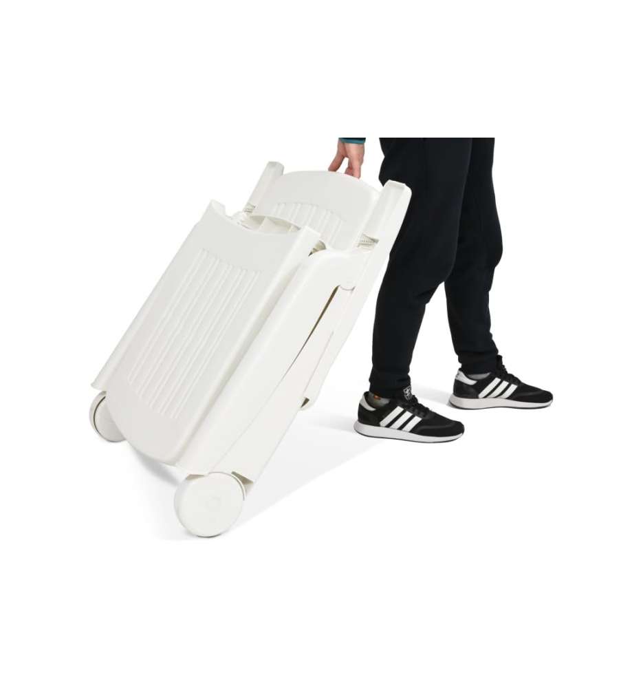 Lettino Cancun in polipropilene bianco, pieghevole e dotato di ruote per facile trasporto. Dimensioni 72x190x60 cm, schienale regolabile (max 99 cm, min 63 cm). Finitura lucida e resina riciclabile per un design eco-friendly.Uso esterno:
