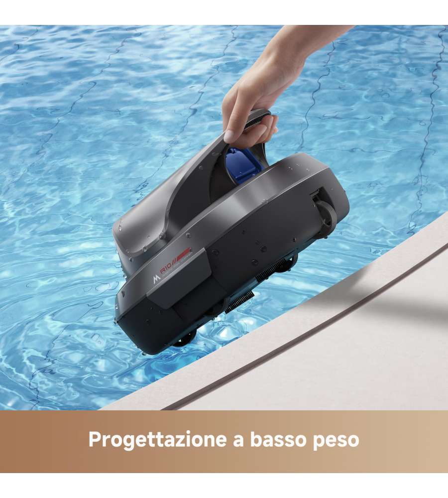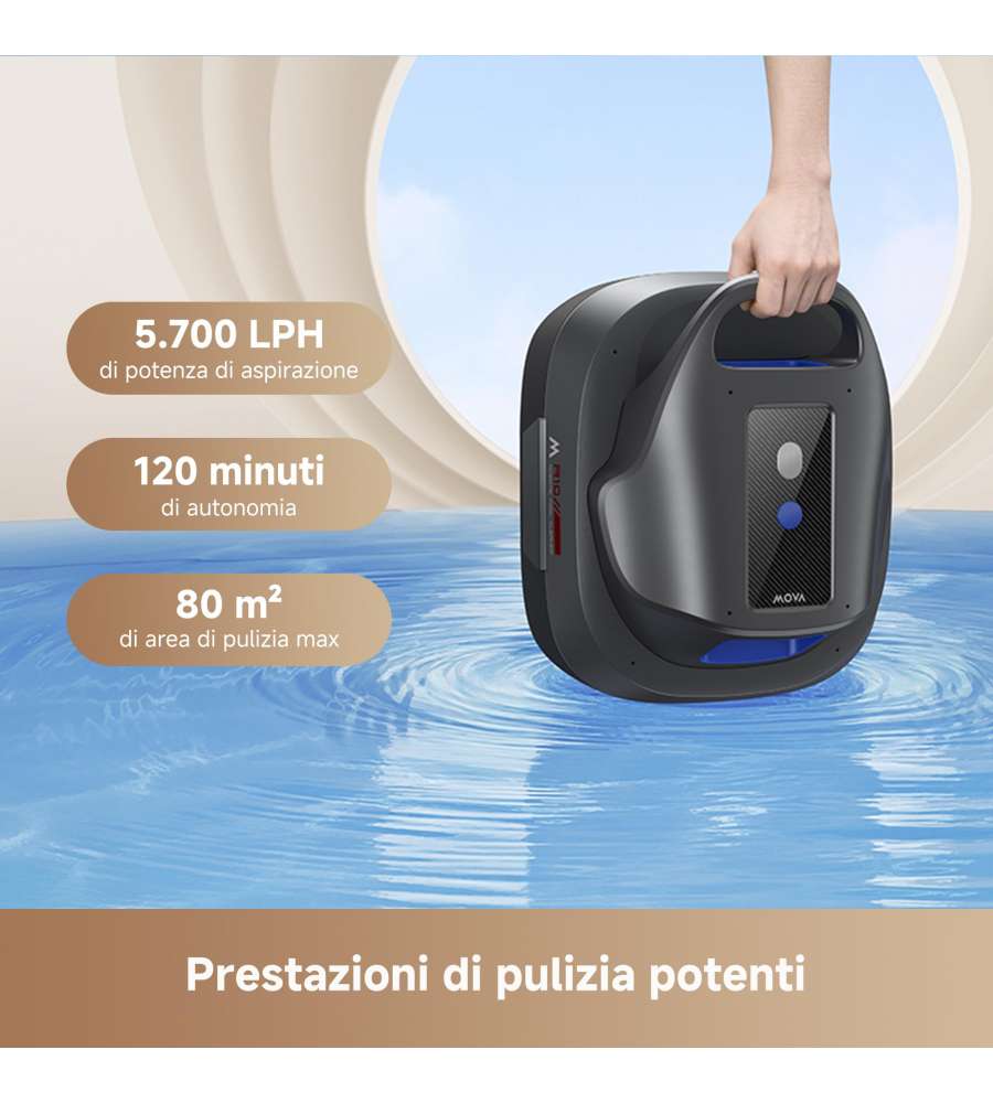 Descrizione: Scopri il ROBOT PISCINA MOVA DRIVE R10: pulitore cordless con doppio motore e 5.700 LPH di potenza. Autonomia di 120 min, avvio a un tocco e parcheggio automatico. Ideale per piscine fino a 80 m²!