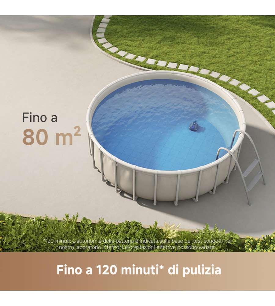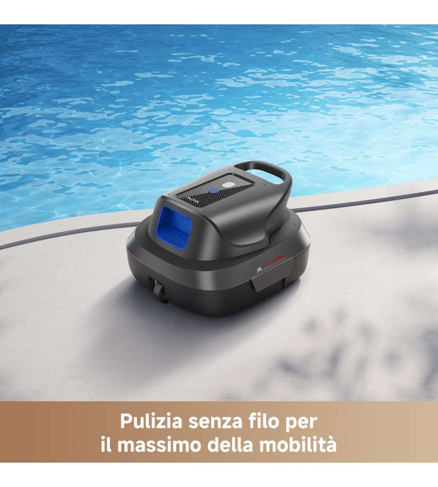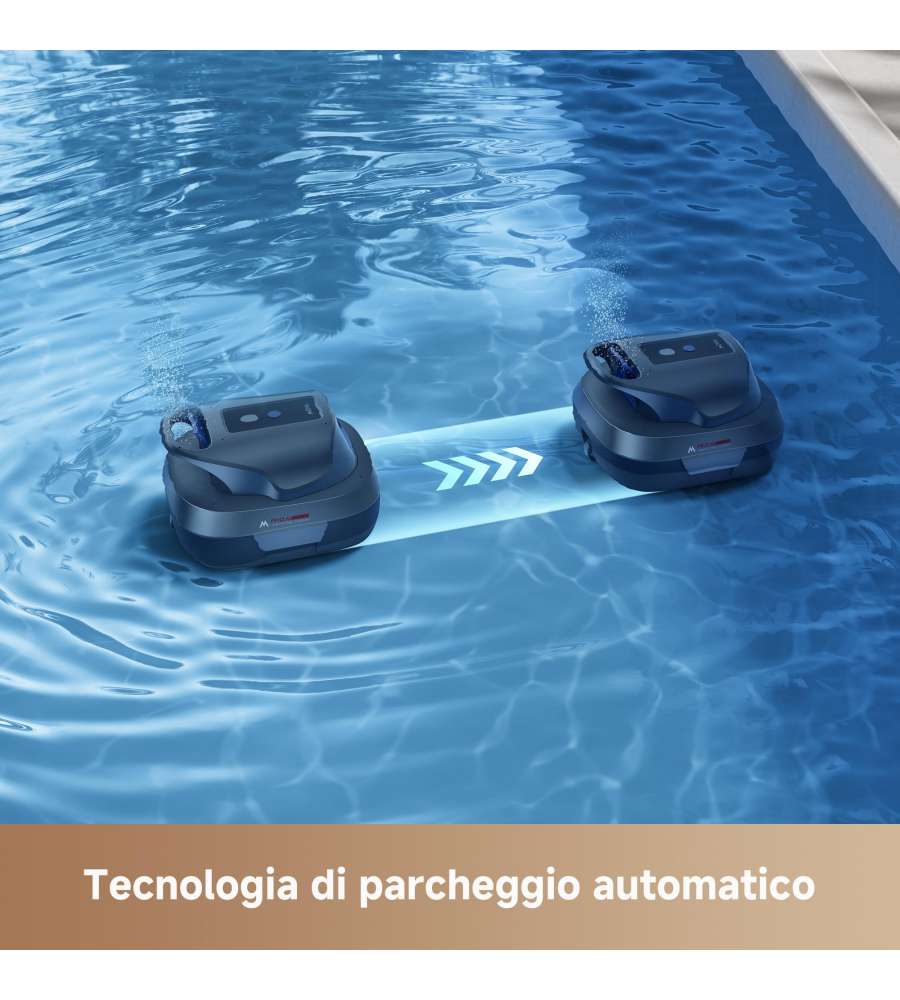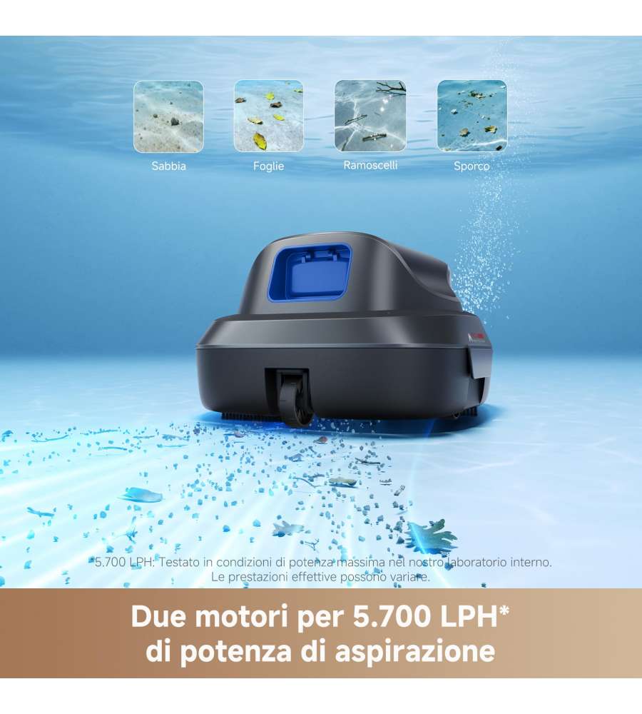 Robot pulitore senza filo per piscine, dotato di doppio motore e due bocche di aspirazione per 5.700 LPH di potenza. Autonomia di 120 minuti, avvio a un tocco, tecnologia di parcheggio automatico e design compatto e leggero.Capacità: