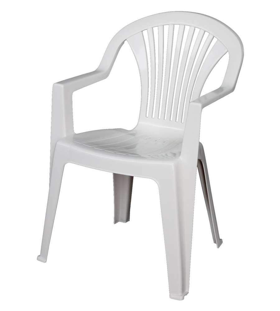 Sedia Lido bianca in polipropilene, resistente agli agenti atmosferici e ai raggi UV. Design ergonomico con braccioli, schienale alto ventilato. Impilabile per ottimizzare lo spazio, ideale per giardini e terrazzi. Dimensioni: 57x82x58 cm.Capacità: