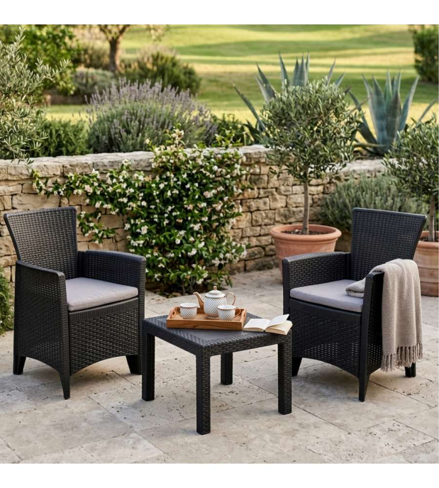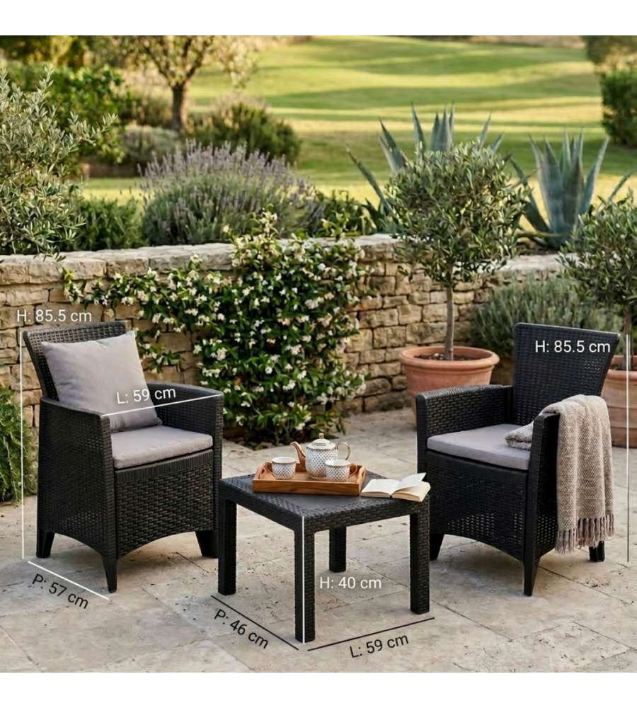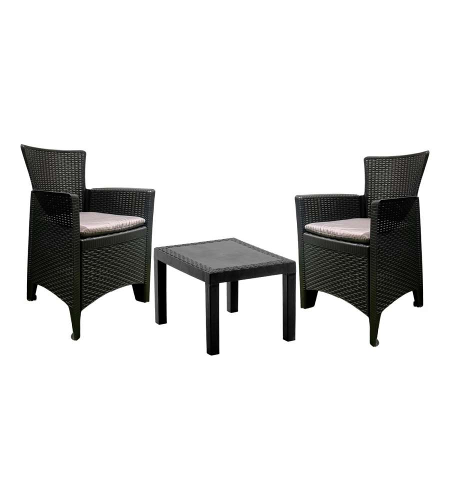 Set salotto da giardino in rattan antracite, composto da 2 poltrone e 1 tavolino. Realizzato in polipropilene, resistente e leggero. Dimensioni poltrona: 59x57x85.5 cm, tavolino: 59x46x40 cm. Peso totale: 12 kg. Adatto per interni ed esterni.Materiale seduta: