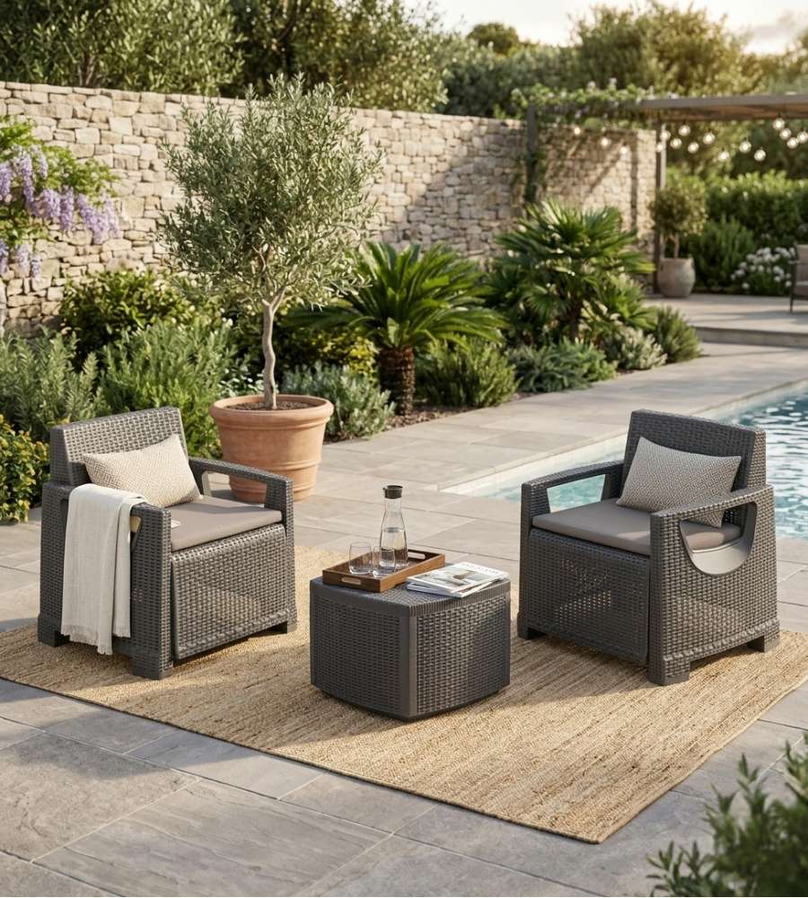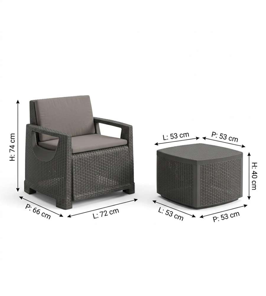 Set salottino in polipropilene antracite, composto da 2 poltrone e 1 tavolino contenitore. Design elegante, resistente alle intemperie, ideale per esterni e giardini. Facile da pulire e mantenere. Poltroncine con cuscini per maggior comfort.Uso esterno: