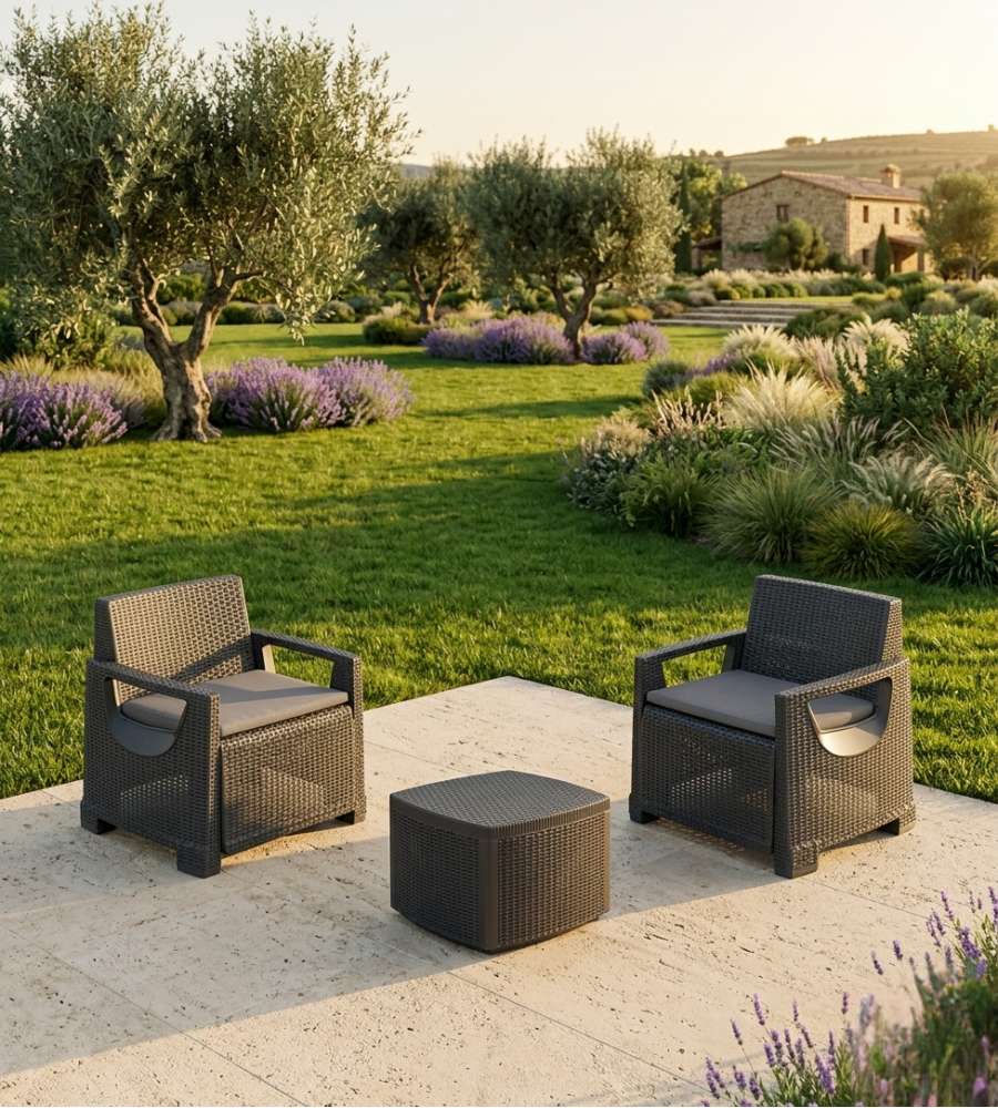Set salottino in polipropilene antracite, composto da 2 poltrone e 1 tavolino contenitore. Design elegante, resistente alle intemperie, ideale per esterni e giardini. Facile da pulire e mantenere. Poltroncine con cuscini per maggior comfort.Uso esterno: