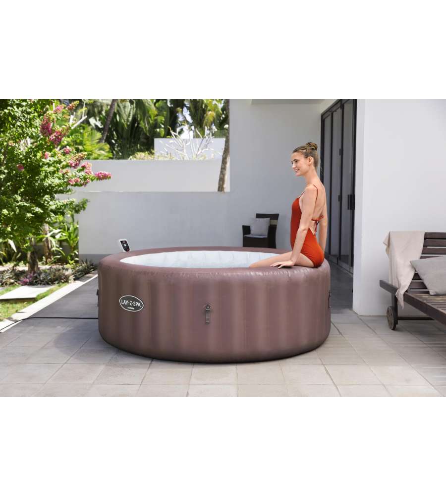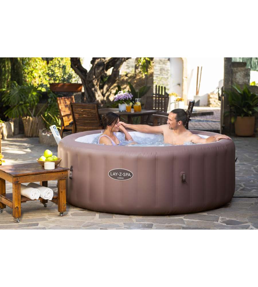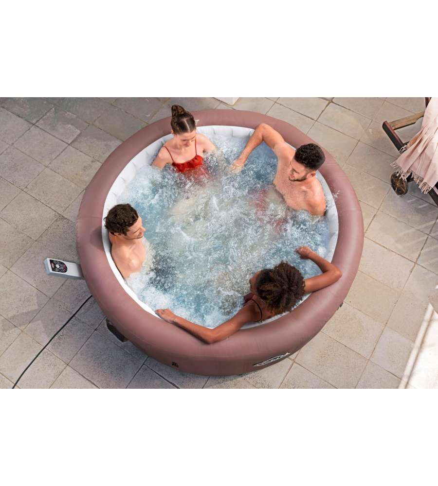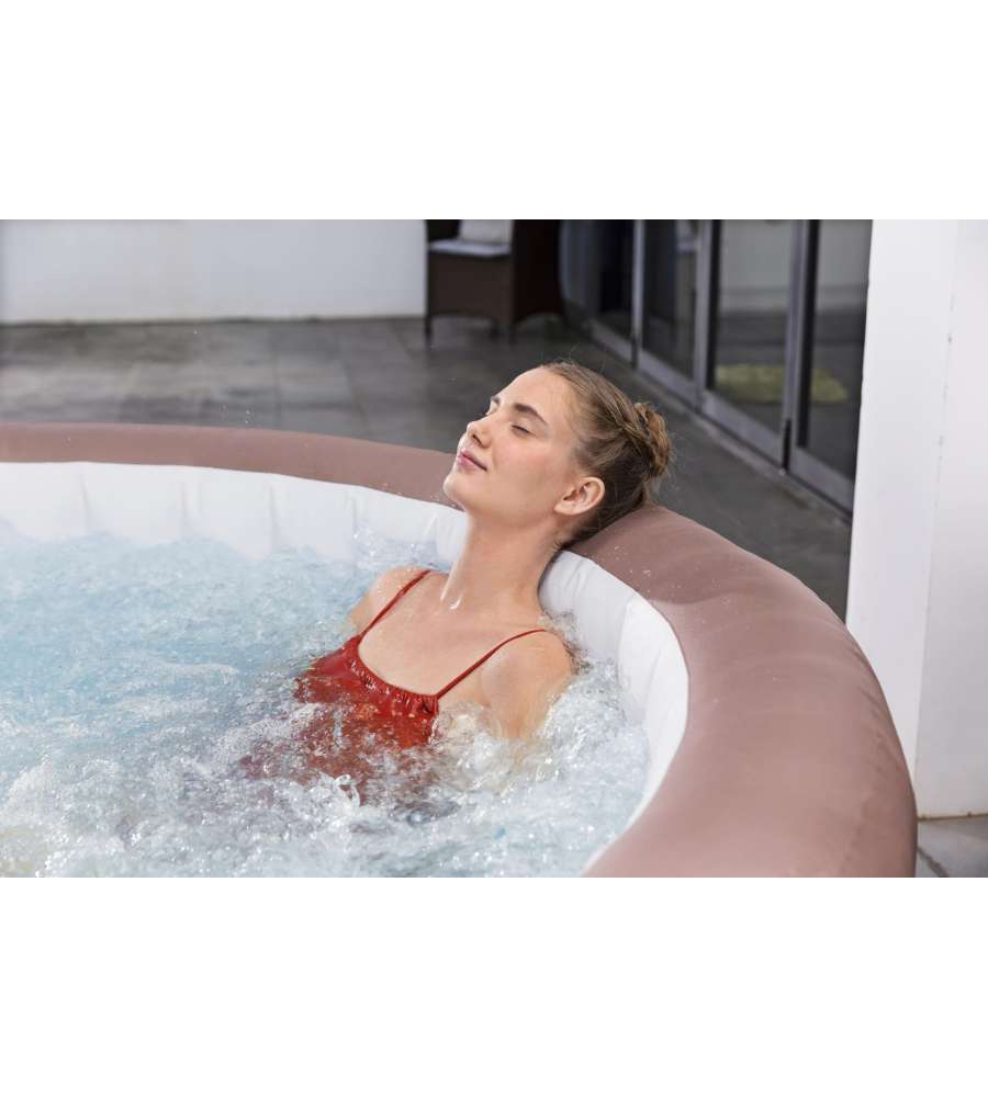 Idromassaggio gonfiabile rotondo Bestway Hawaii per 6 persone, dimensioni 196x71 cm, capacità 916 litri. Include pompa filtrante, dispenser ChemConnect e copertura. Sistema AirJet per massaggio rilassante. Colore terracotta.Capacità: