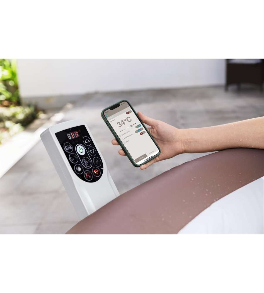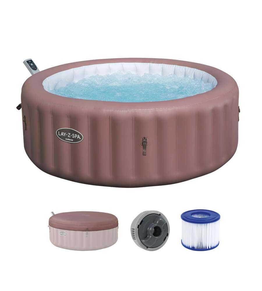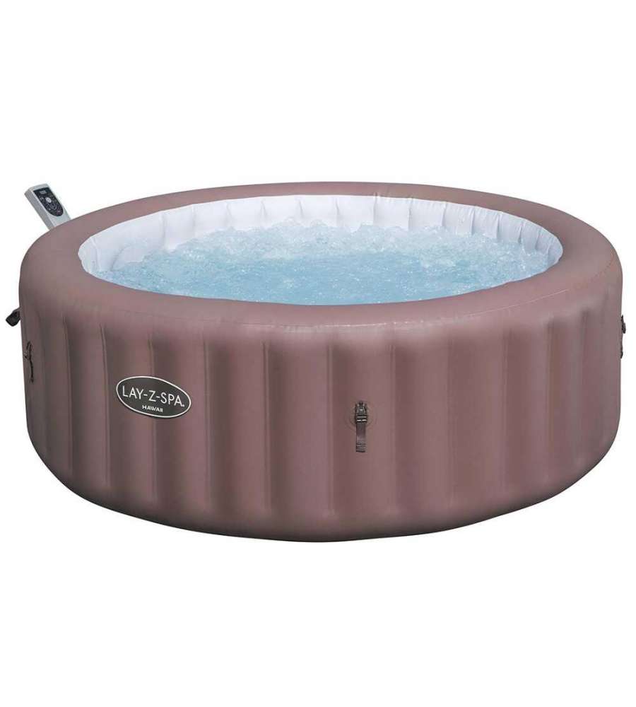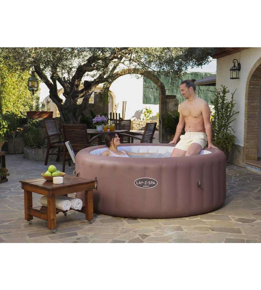Idromassaggio gonfiabile rotondo Bestway Hawaii per 6 persone, dimensioni 196x71 cm, capacità 916 litri. Include pompa filtrante, dispenser ChemConnect e copertura. Sistema AirJet per massaggio rilassante. Colore terracotta.Capacità: