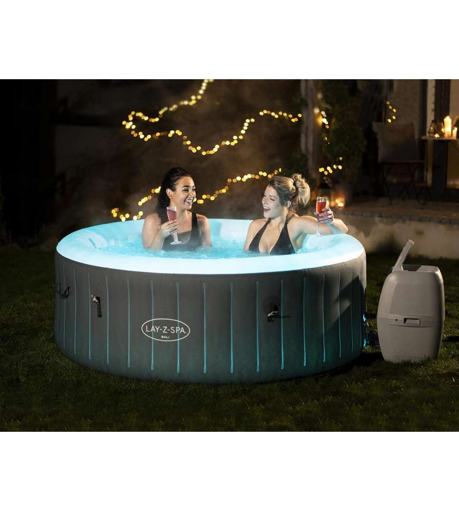 Piscina idromassaggio gonfiabile Lay-Z-Spa Bali AirJet, perfetta per 2/4 adulti. Dotata di luci LED multicolore, 120 getti d'aria massaggianti, facile da gonfiare e controllare. Include telo copertura e pompa multifunzione. Vai alla descrizione completa