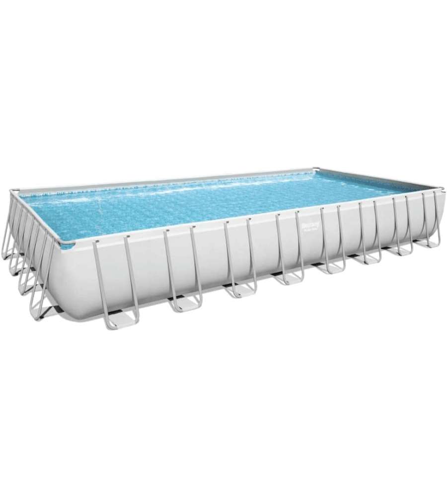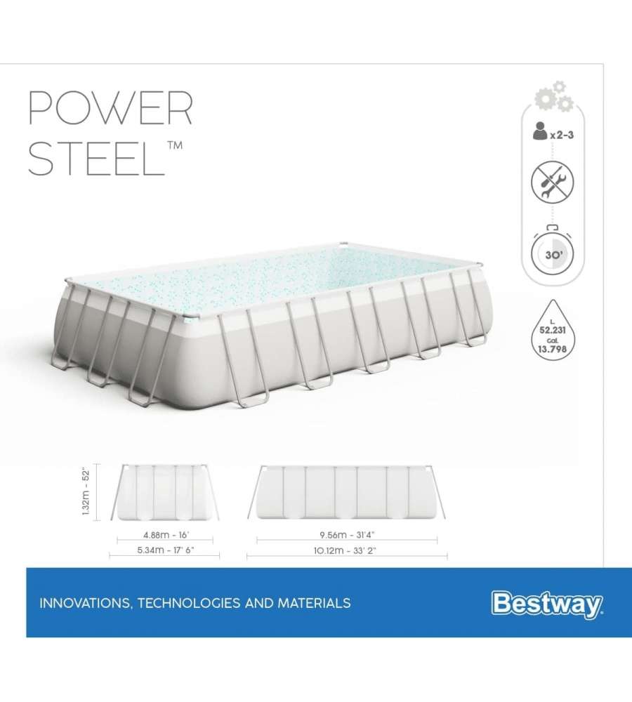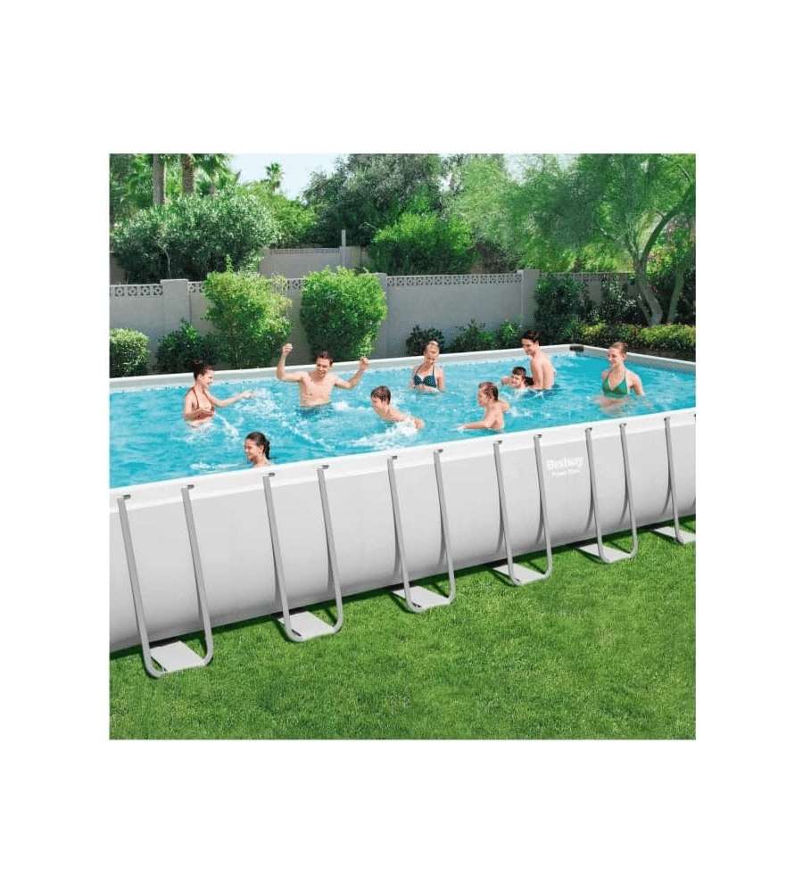 Piscina rettangolare fuori terra con telaio in acciaio resistente alla corrosione. Dimensioni: 956x488x132 cm, capacità 52.231 litri. Include filtro a sabbia, scala di sicurezza, telo di copertura e valvola di scarico integrata. Montaggio senza attreCapacità: