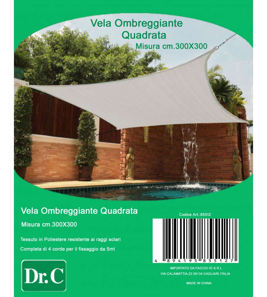 Vela ombreggiante quadrata, 3x3 m, in poliestere 200 g, colore ecrù, resistente ai raggi UV. Include 4 corde da 5 m e sacca per il trasporto.Materiale copertura: