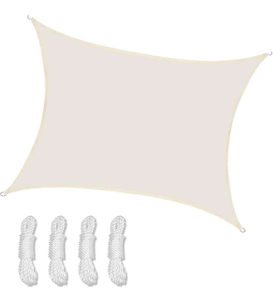 Vela ombreggiante rettangolare ecrù, dimensioni 3 x 4 m, in poliestere 200 g/m² resistente ai raggi UV. Include 4 corde da 5 m e sacca per il trasporto.Materiale copertura:
