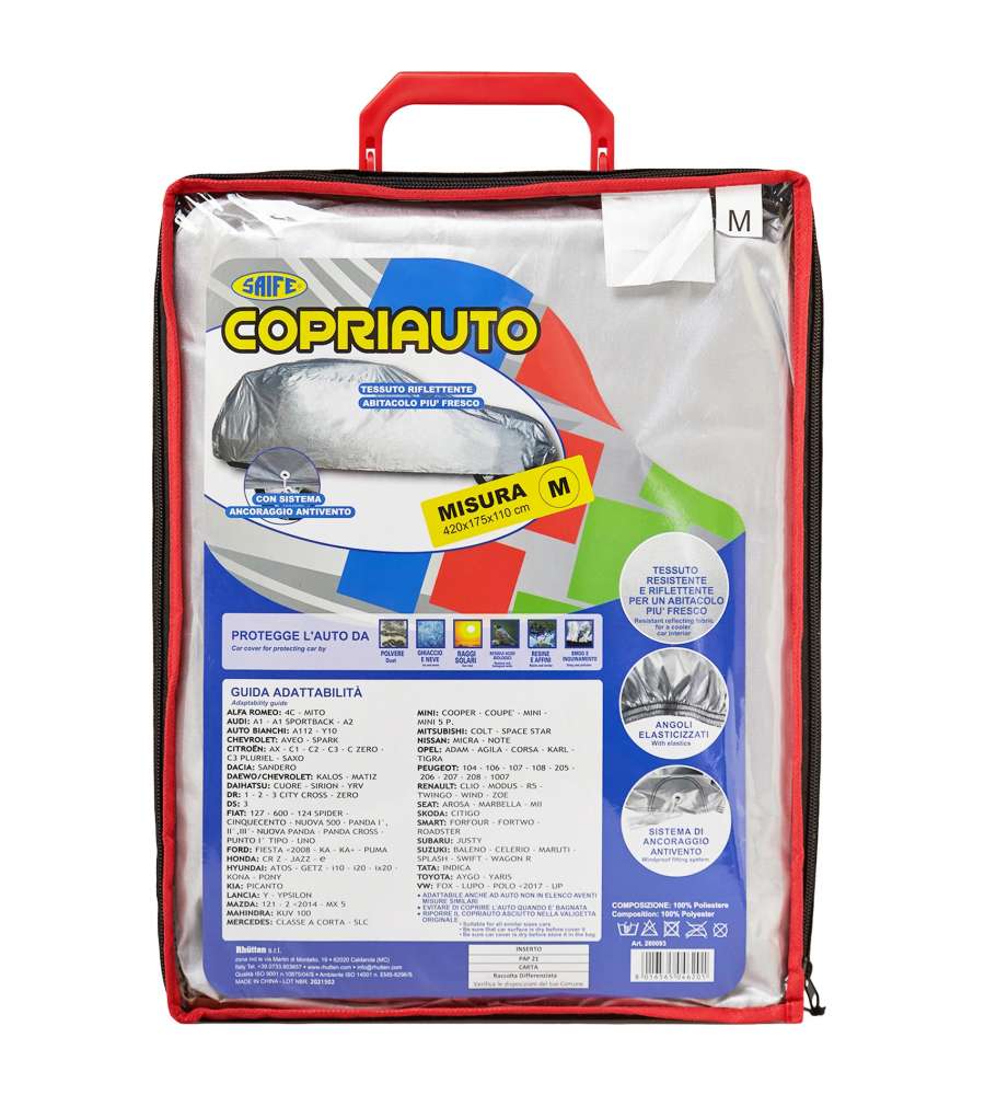 Telo copriauto impermeabile misura M, realizzato in tessuto resistente e riflettente. Sistema di ancoraggio antivento e angoli elasticizzati per una protezione ottimale. Ideale contro polvere, neve, ghiaccio e raggi UV.Destinazione d'uso: