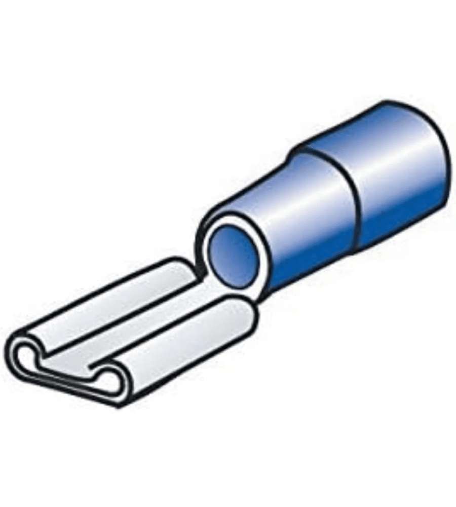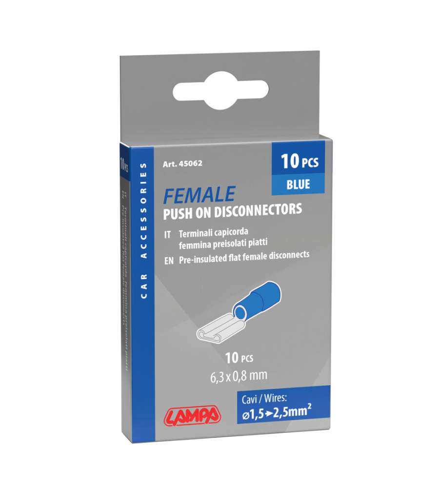 Descrizione: Set di 10 terminali capicorda femmina piatti blu Lampa 45062, realizzati con materiali preisolati per cavi da 1,5 a 2,5 mm². Di dimensione 6,3x0,8 mm.