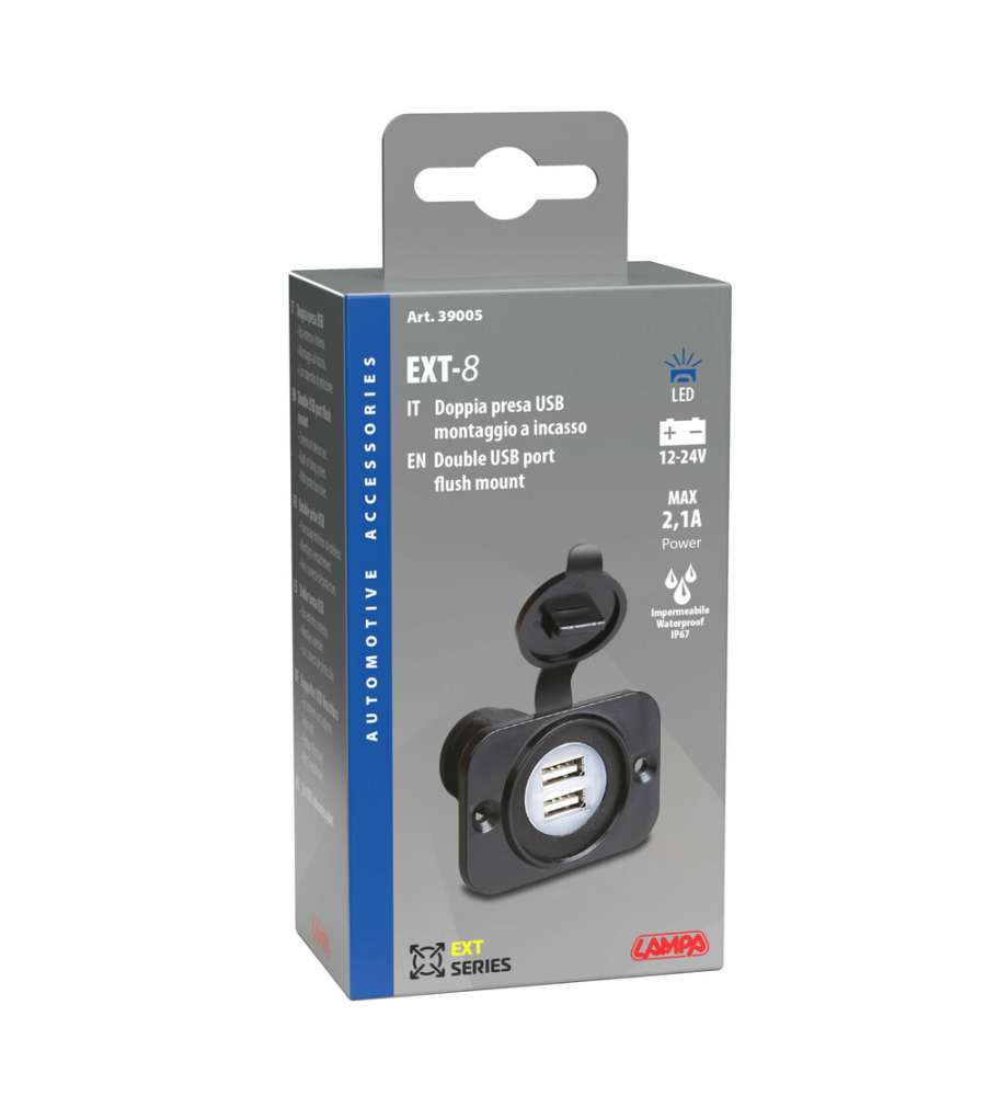 Descrizione: Scopri la Doppia Presa USB per auto Lampa 39005, montaggio ad incasso 12/24V. Perfetta per uso interno ed esterno, con coperchio di chiusura. Ideale per alimentare dispositivi in movimento!