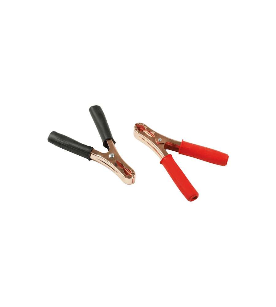 Coppia di pinze per cavi batterie in metallo zincato, impugnatura isolata. Corrente massima 120 A, lunghezza 150 mm. Utilizzo multifunzionale per batterie, trasformatori e caricabatterie. Colori rosso e nero, peso 215 g.Destinazione d'uso: