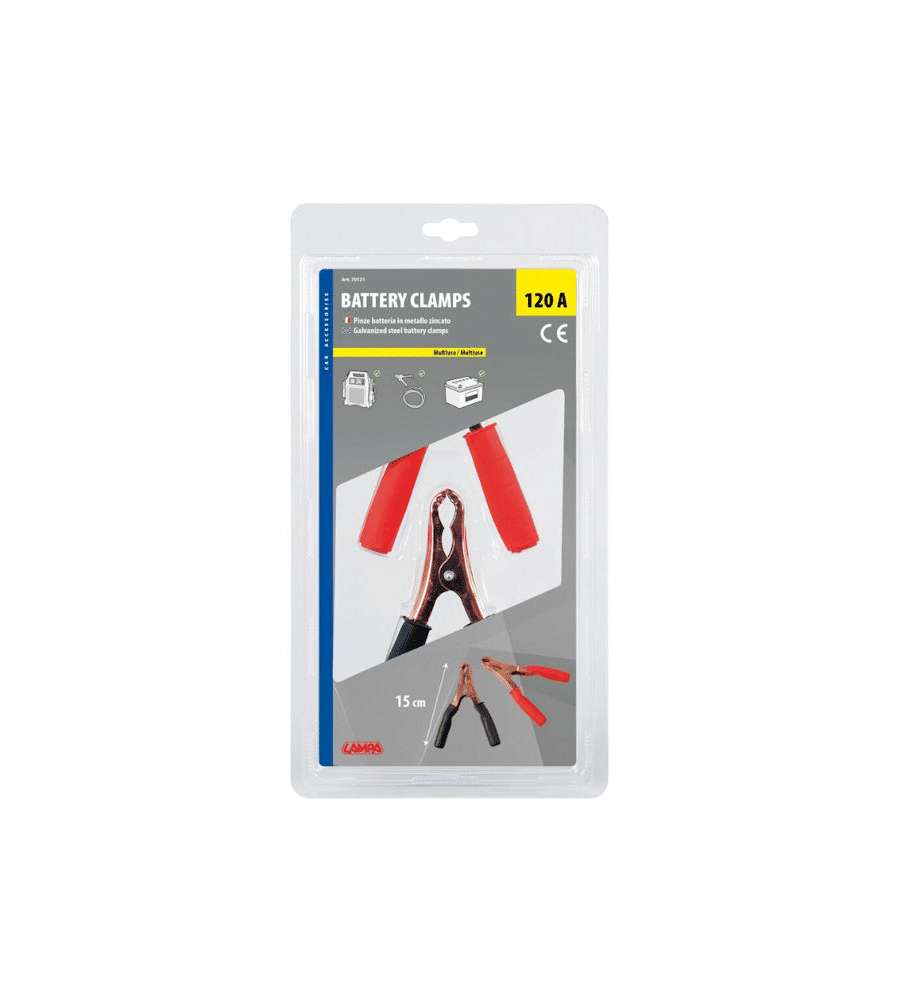 Descrizione: Coppia di pinze per cavi batterie Lampa 70121, in metallo zincato con impugnatura isolata. Massima corrente 120A, lunghezza 150mm. Ideali per batterie, trasformatori e caricabatterie. Robustezza e praticità in un design rosso e nero.