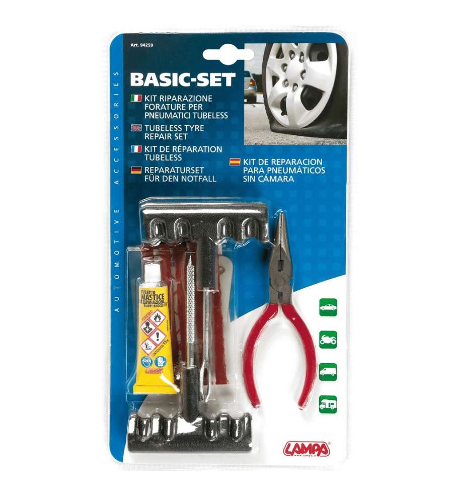 Descrizione: Ripara le forature dei pneumatici tubeless con il Kit Riparazione Lampa Basic-Set. Include pinza, punteruolo, sonda, mastice da 13gr, 5 otturatori e cutter per interventi rapidi ed efficaci.