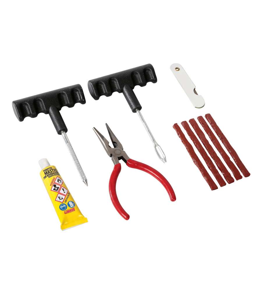 Kit completo per riparazione pneumatici tubeless, include pinza, punteruolo, sonda per otturatori, tubetto di mastice da 13g e 5 otturatori. Design pratico e materiali di alta qualità per una riparazione efficace e duratura.Destinazione d'uso: