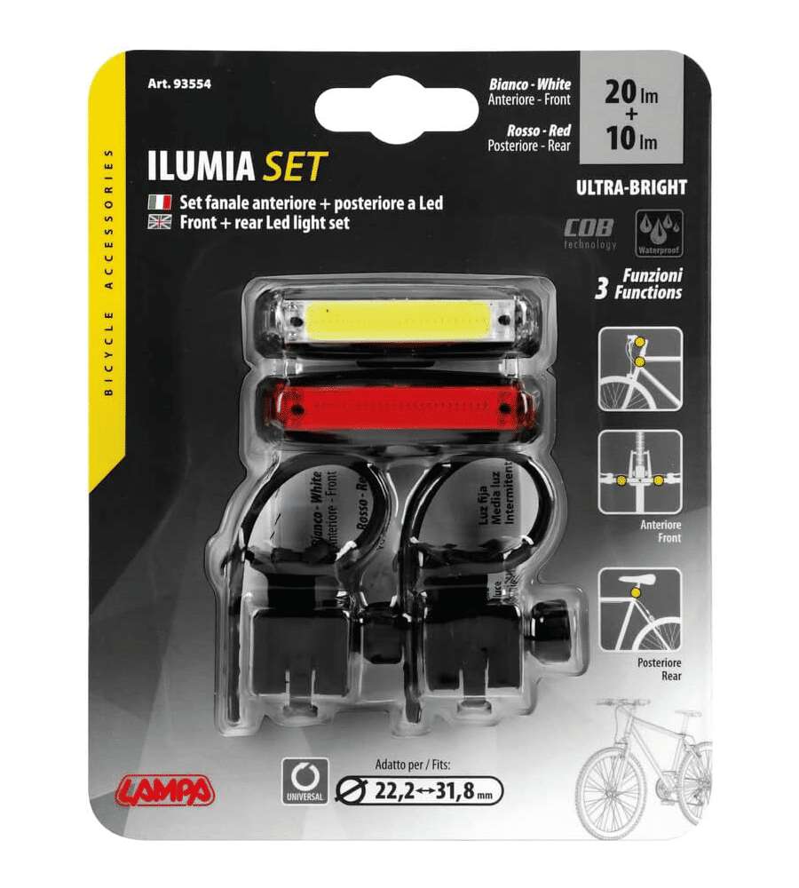 Descrizione: Set fanali LED Lampa 93554: fanale anteriore bianco 20 lm e posteriore rosso 10 lm. 3 modalità di illuminazione, montaggio universale per manubri Ø 22,2-31,8 mm. Include batterie CR2032. Illumina il tuo viaggio!