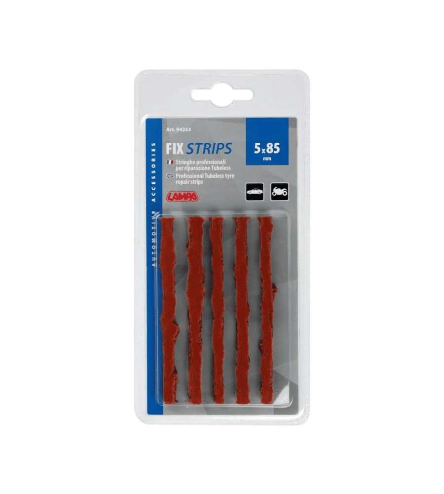 Descrizione: Ripara i tuoi pneumatici tubeless con il Fix Strips Lampa. Include 5 strisce professionali auto-vulcanizzanti da 85 mm, ideali per auto e moto. Soluzione rapida e duratura per ogni emergenza!